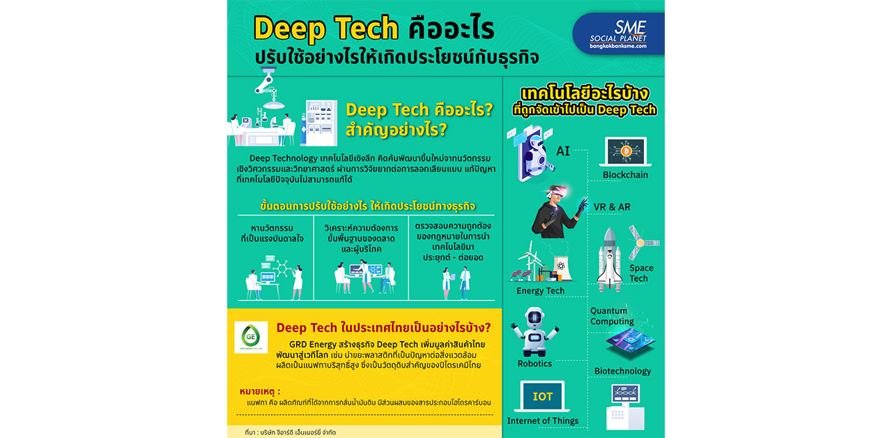 โดยลักษณะของ Deep Tech จะแก้ปัญหาที่เทคโนโลยีปัจจุบันไม่สามารถแก้ได้ ยากต่อการลอกเลียนแบบ จึงได้เปรียบในการแข่งขันภาคธุรกิจมากขึ้น พร้อมศึกษาแนวทางสำคัญกับขั้นตอนการปรับใช้ ในการสร้างธุรกิจ Deep Tech จาก บริษัท จีอาร์ดี เอ็นเนอร์ยี่ จำกัด เพื่อหวังว่าจะสามารถช่วยผู้ประกอบการ SME ไทย และบริษัทชั้นนำของไทย ในการเพิ่มมูลค่ามหาศาลกับธุรกิจไทย