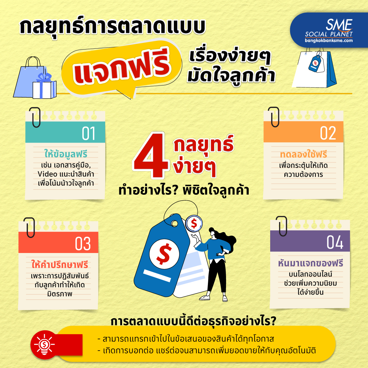 กระตุ้นยอดขาย ด้วยเทคนิคการตลาดแบบ ‘แจกฟรี’ กลยุทธ์พิชิตใจผู้บริโภคได้ง่ายๆ ด้วยการลองเปลี่ยนจากการยัดเยียดขายมาเป็นการแนะนำ ให้คำปรึกษาฟรี แล้วค่อยๆ พัฒนาสู่การขาย เนื่องจากการแจกฟรีหรือการใช้บริการแบบไม่คิดเงิน ถือเป็นอีกกลยุทธ์ที่จะสามารถช่วยกระตุ้นความสนใจผู้บริโภคได้ดี แต่ถ้าอยากให้กลยุทธ์นี้เกิดประสิทธิภาพมากขึ้น ก็ต้องแจกคุณภาพไปพร้อมกับของด้วย เพราะจะช่วยสร้างภาพจำที่ดีให้กับแบรนด์ได้ในระยะยาว