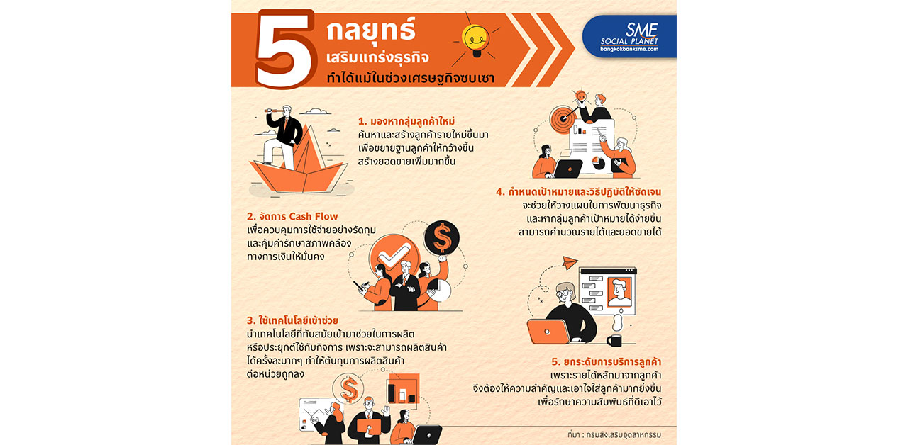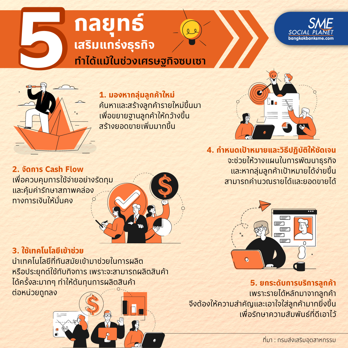 วันนี้ Bangkok Bank SME จึงอยากชี้ให้เห็นถึง 5 กลยุทธ์การดำเนินงานให้เติบโตและผ่านไปได้ทุกสถานการณ์เศรษฐกิจ
