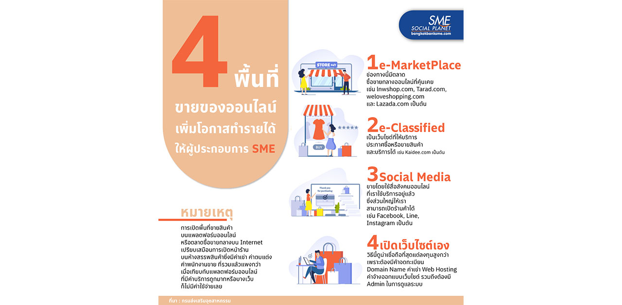 ปัจจุบันผู้คนมีการใช้ SocialMedia หรือ Internet ในช่องทางต่างๆ เป็นอย่างมาก จึงทำให้หลายธุรกิจหันมาทำตลาดบนพื้นที่ออนไลน์ตามไปด้วยเพื่อให้เข้าถึงกลุ่มเป้าหมายได้ตรงจุด ซึ่งรูปแบบนี้มีข้อดีหลายด้านเพราะไม่ต้องพึ่งหน้าร้านแบบ Onsite ทั้งช่วยลดค่าใช้จ่ายในการจ้างพนักงาน และการบริหารจัดการได้อย่างสะดวก ดังนั้น Bangkok Bank SME จึงอยากพาไปรู้จักกับ 4 พื้นที่ขายของออนไลน์ที่จะเพิ่มโอกาสทำรายได้ให้ผู้ประกอบการ SME