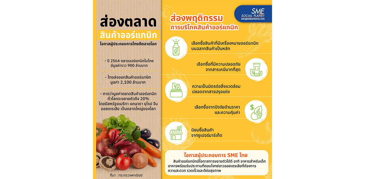 ซึ่งผลิตภัณฑ์ออร์แกนิกก็ยังได้รับผลตอบรับที่ดีเสมอของผู้บริโภคใหม่ เช่นเดียวกับผู้ประกอบการหลายรายที่หันมาทำธุรกิจเกี่ยวกับสินค้าผลิตภัณฑ์ออร์แกนิกมากขึ้น Bangkok Bank SME จึงพาไปส่องตลาดสินค้าออร์แกนิก พร้อมส่องพฤติกรรมผู้บริโภค กับโอกาสผู้ประกอบการไทยส่งออกตลาดโลก
