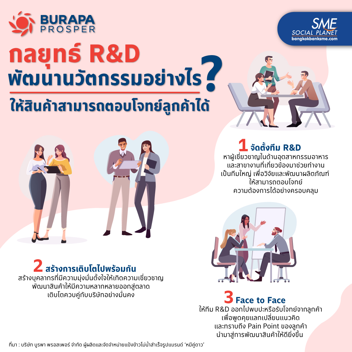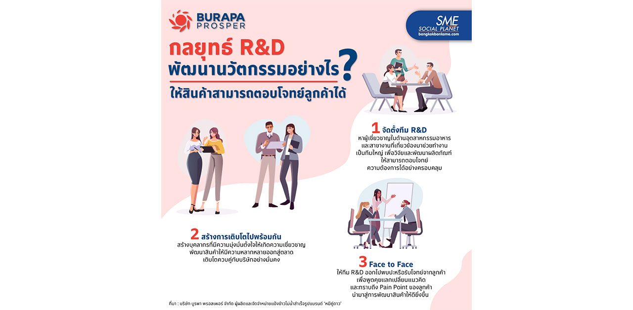 การสร้างทีม R&D ที่มีผู้เชี่ยวชาญในสาขางานที่เกี่ยวข้องมาช่วยวิจัยและพัฒนาผลิตภัณฑ์สินค้า จะสามารถตอบโจทย์ความต้องการของลูกค้าได้ พร้อมทั้งยังช่วยยกระดับกระบวนการผลิตสู่ความทันสมัย เช่นเดียวกับ บริษัท บูรพา พรอสเพอร์ จำกัด ผู้ผลิตและจัดจำหน่ายแป้งข้าวโม่น้ำสำเร็จรูปแบรนด์ ‘หมีคู่ดาว’ ที่มีการลงทุนด้าน R&D จนสามารถพัฒนาสินค้าให้มีความหลากหลายออกสู่ตลาด และทีมบุคลากรยังเติบโตควบคู่ไปพร้อมกันกับบริษัทได้อย่างมั่นคง