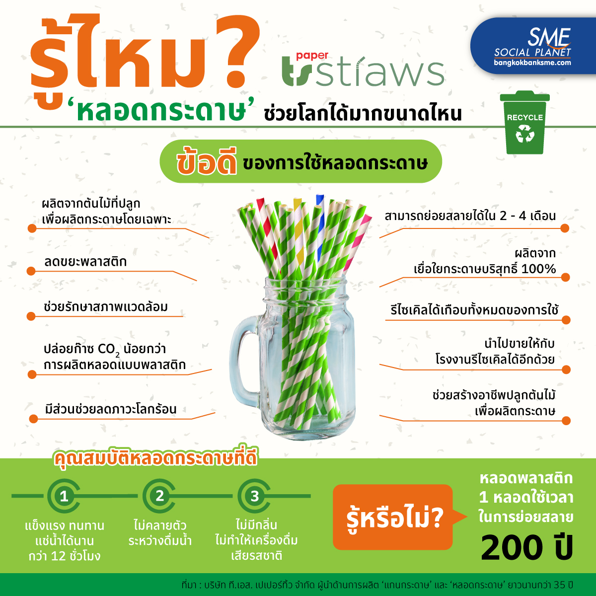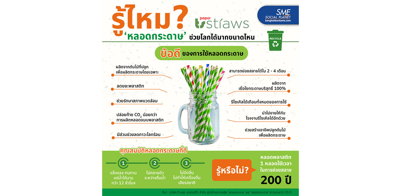กระแสรณรงค์เลิกใช้พลาสติก เช่น ถุง กล่อง รวมถึงหลอดพลาสติก เป็นที่พูดถึงมากขึ้นเรื่อยๆ ส่งผลให้ผู้ประกอบการและ SME หันมาตระหนักถึงผลเสียที่เกิดขึ้นจากการใช้พลาสติกมากขึ้น อย่างเช่น บริษัท ที.เอส. เปเปอร์ทิ้ว จำกัด ที่ต้องการเป็นส่วนหนึ่งที่ช่วยให้สังคมมีสิ่งแวดล้อมที่ดีอย่างยั่งยืน