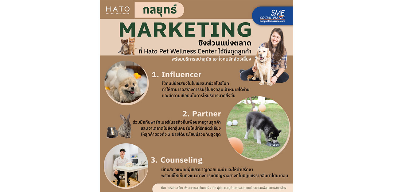รวมทั้งมีผู้เชี่ยวชาญให้คำปรึกษากับลูกค้าเพื่อแก้ปัญหาอย่างมีประสิทธิภาพ ก็เป็นสิ่งสำคัญไม่แพ้กัน เช่นเดียวกับที่ บริษัท ฮาโตะ เพ็ท เวลเนส เซ็นเตอร์ จำกัด ได้ใช้แนวทางดังกล่าวในการทำตลาดจนทำให้ธุรกิจเติบโตได้อย่างต่อเนื่อง