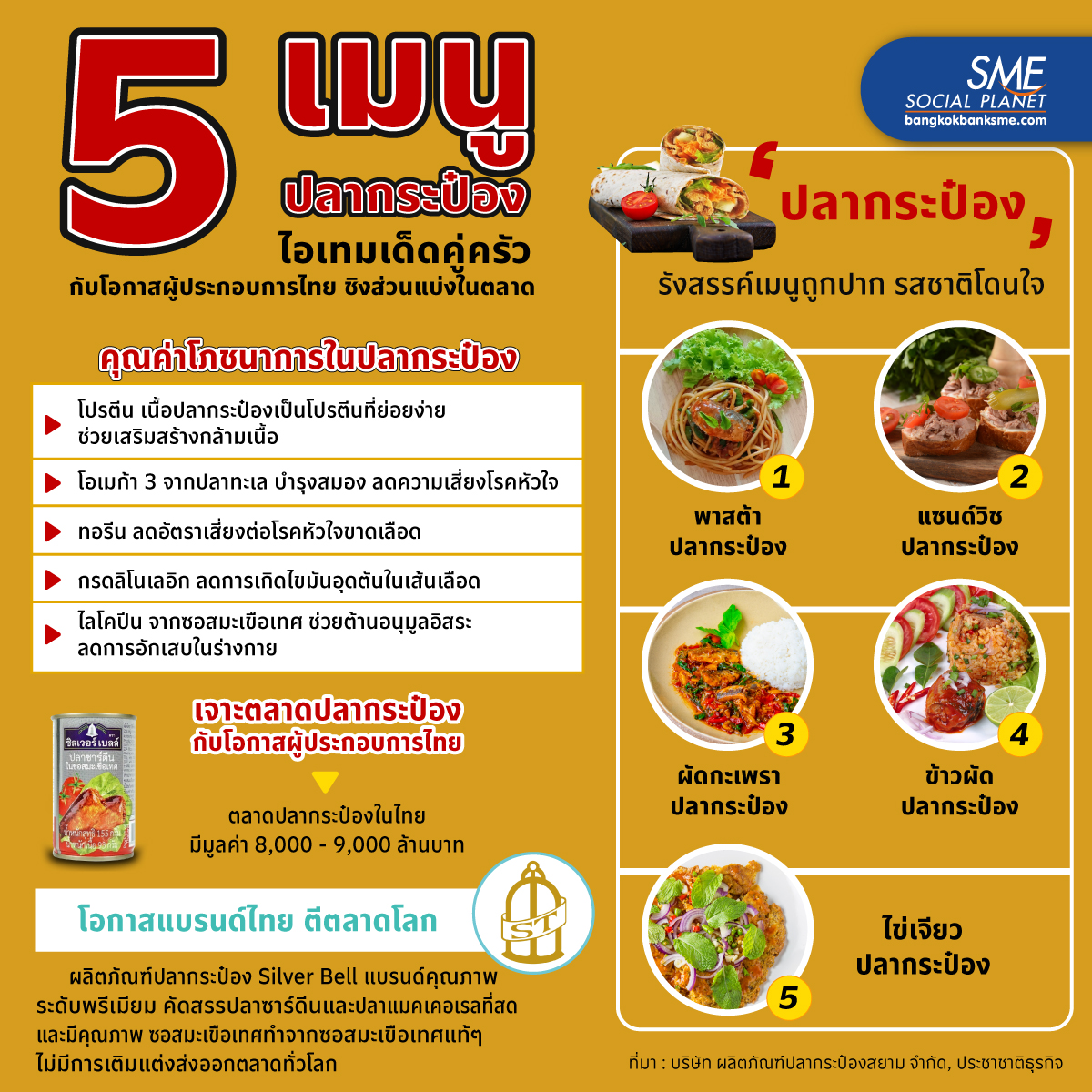ปลากระป๋องไอเทมเด็ดคู่ครัว หนึ่งในเมนูอาหารที่หาซื้อได้ง่าย รับประทานสะดวก ที่สำคัญสามารถรังสรรค์ได้หลากหลายเมนูถูกปาก รสชาติโดนใจ ที่ใครๆ ก็ทำได้ พร้อมเจาะตลาดปลากระป๋องในไทยที่มีมูลค่ากว่า 8,000 - 9,000 ล้านบาท กับตัวอย่างความสำเร็จของผู้ประกอบการไทย ผู้ผลิตปลากระป๋องคุณภาพพรีเมียมแบรนด์ Silver Bell จากบริษัท ผลิตภัณฑ์ปลากระป๋องสยาม จำกัด ในการตีตลาดโลกได้อย่างประสบความสำเร็จ