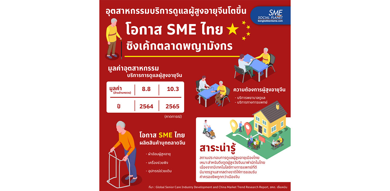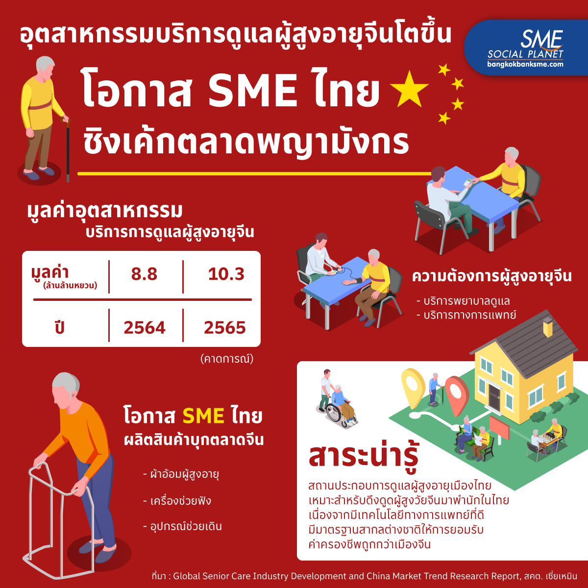 ผู้ประกอบการและ SME ไทย มองเห็นเป็นโอกาส ประเทศจีนผู้สูงอายุเพิ่มจำนวนขึ้นเรื่อยๆ โดยปัจจุบันคิดเป็นร้อยละ 13.5 ของประเทศที่มีประชากรอายุ 65 ปีขึ้นไป ซึ่งสูงกว่าค่าเฉลี่ยทั่วโลก ร้อยละ 9.3 จึงเป็นโอกาสดีสำหรับภาคธุรกิจบ้านเราในการผลิตและพัฒนาสินค้าหรือบริการเพื่อตอบโจทย์กลุ่มเป้าหมาย ซึ่งจะมีประเด็นใดน่าสนใจบ้างนั้น Bangkok Bank SME หาคำตอบมาให้แล้ว
