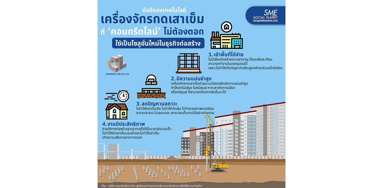 โดยเรื่องนี้ ‘บริษัท คอนกรีตไลน์ จำกัด’ ที่เป็นผู้นำเข้ามาใช้ในงานเสาเข็มได้ตระหนักถึงการแก้ปัญหาดังกล่าวให้มีประสิทธิภาพสูงสุด และยังนับว่าเป็นการช่วยยกระดับวงการธุรกิจก่อสร้างให้ก้าวหน้าได้อีกด้วย