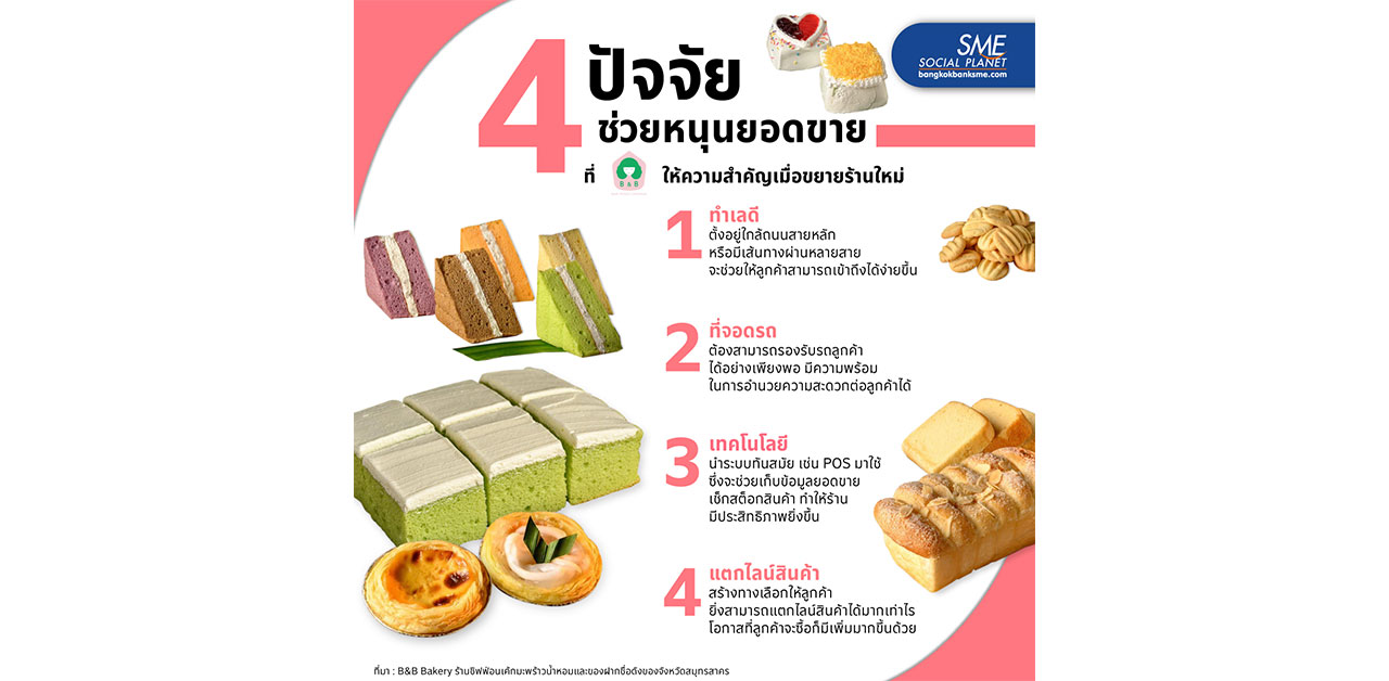 แนวทางของผู้ประกอบการร้านอาหาร ร้านขายของฝาก หรือร้านขายของกิน หากต้องการขยับขยายธุรกิจเพื่อรองรับกับกำลังซื้อลูกค้าและสร้างยอดขายให้เติบโตเพิ่มมากขึ้น ต้องตระหนักถึงปัจจัยที่เกี่ยวข้องอย่างรอบด้าน จึงจะทำให้การดำเนินงานเป็นไปอย่างราบรื่น เช่นเดียวกับ B&B Bakery ร้านชิฟฟ่อนเค้กมะพร้าวน้ำหอมและของฝากชื่อดังของจังหวัดสมุทรสาคร ที่มีลูกค้าให้การอุดหนุนสินค้าอย่างต่อเนื่อง