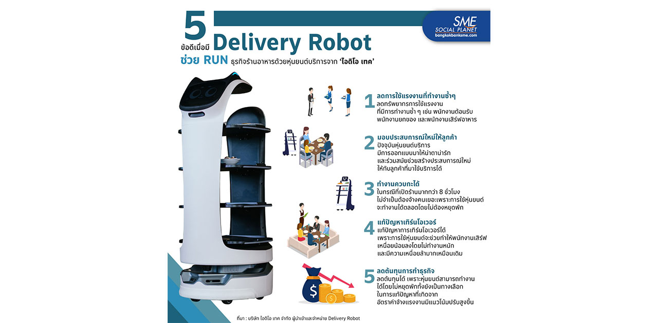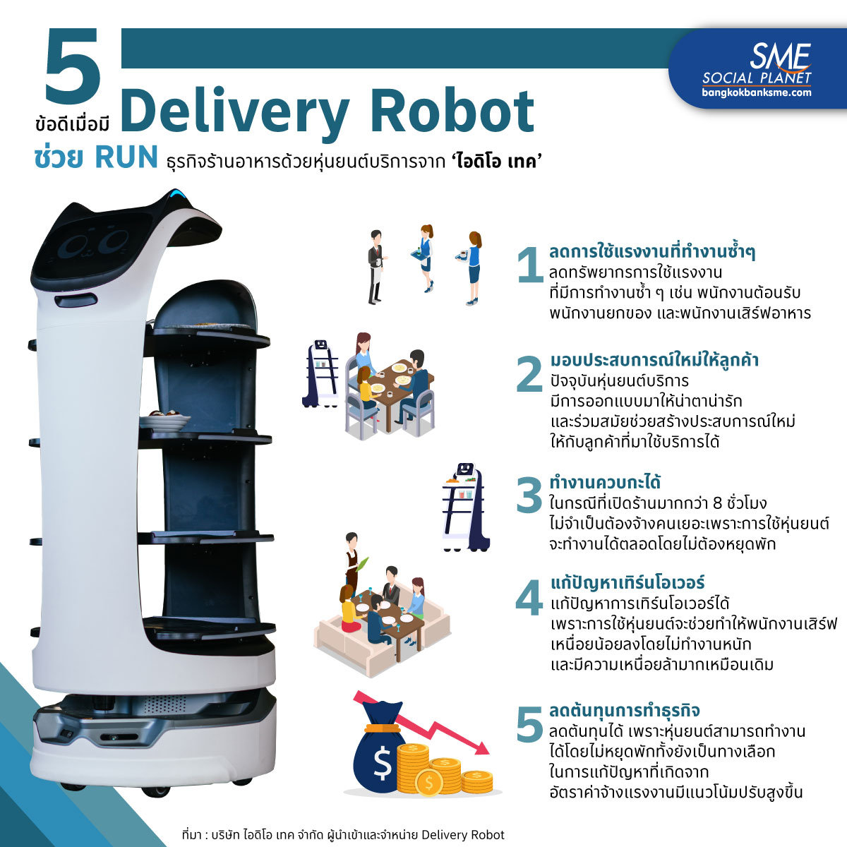 จะเห็นได้ว่าในปัจจุบันธุรกิจร้านอาหารหันมาใช้หุ่นยนต์ในการบริการเพิ่มมากขึ้น เพราะช่วยอุดช่องว่างปัญหาขาดแรงงาน ทั้งยังช่วยประหยัดต้นทุนในระยะยาว และลดความเมื่อยล้าของพนักงานเสิร์ฟ เพราะหุ่นยนต์สามารถทำงานได้ยาวนานและต่อเนื่อง จึงทำให้ผู้นำเข้าและจำหน่ายหุ่นยนต์บริการให้กับหลายร้านดังอย่าง บริษัท ไอดิโอ เทค จำกัด ได้กลายเป็นส่วนหนึ่งในการผลักดันและยกระดับการให้บริการในธุรกิจต่าง ๆ เหล่านี้ด้วย