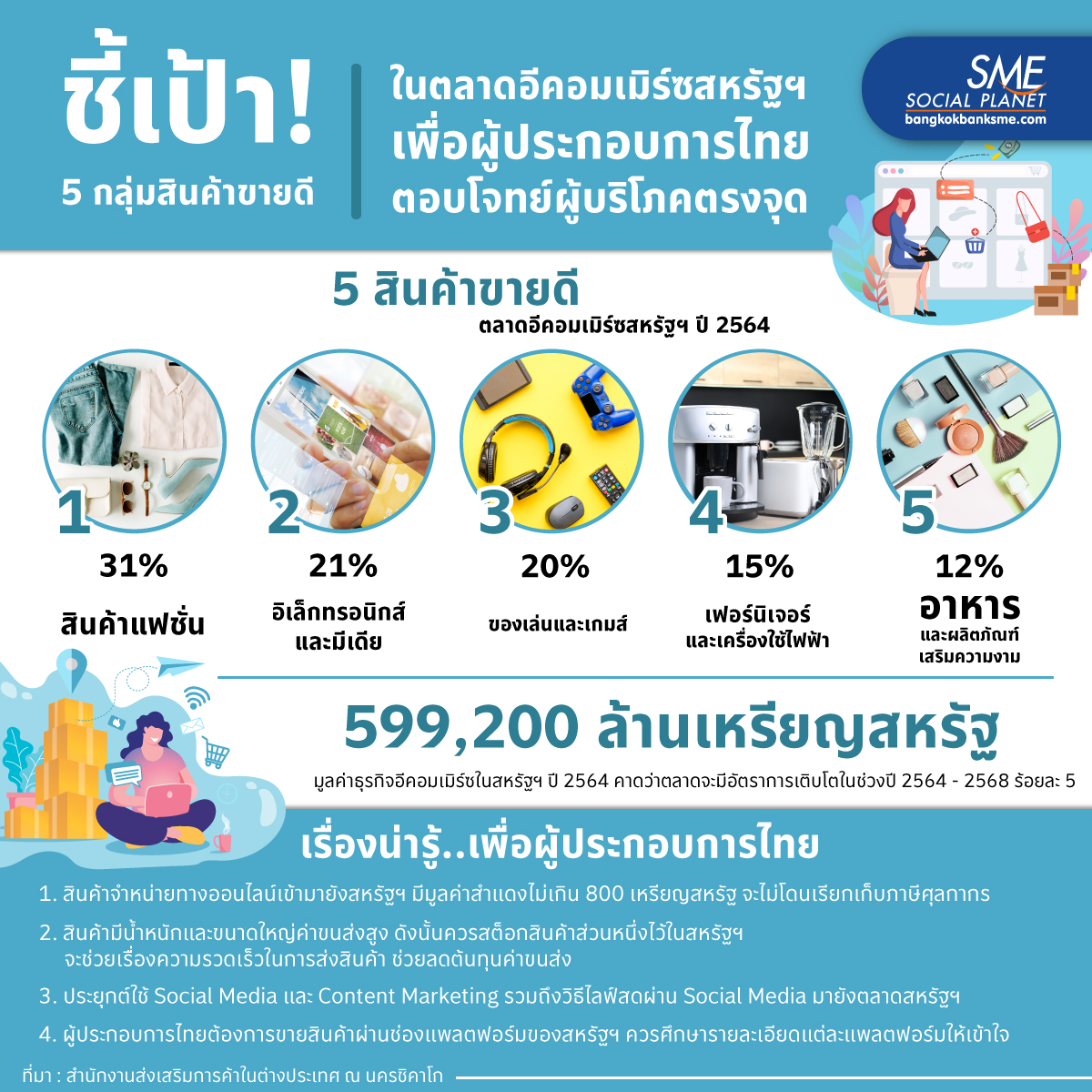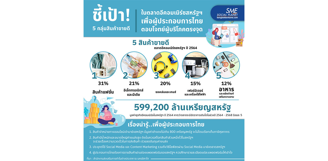 ตลาดอีคอมเมิร์ซสหรัฐฯ เติบโตต่อเนื่องอย่างมีนัยยะ ด้วยเหตุนี้ Bangkok Bank SME จึงขอนำ 5 กลุ่มสินค้าขายดีพร้อมเรื่องน่ารู้มาให้ภาคธุรกิจ ผู้ประกอบ SME ไทยได้ทราบ เพื่อเป็นอีกหนึ่งตัวช่วยให้ผลิตสินค้าตอบโจทย์ผู้บริโภคอย่างตรงจุด ชิงเค้กส่วนแบ่งตลาดอีคอมเมิร์ซแดนมะกันมากยิ่งขึ้น