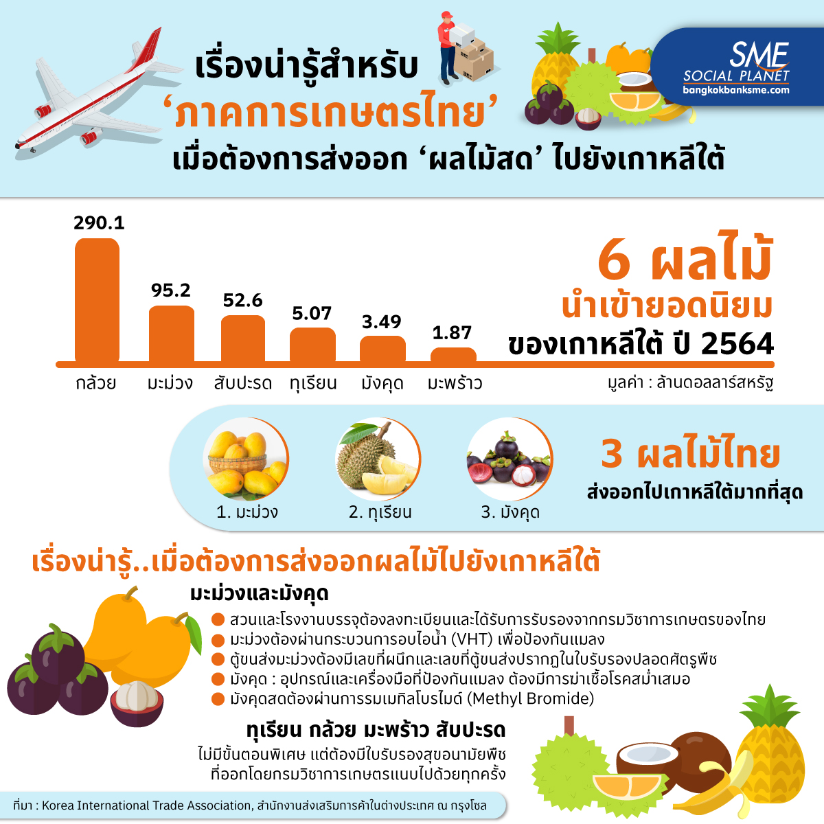 ‘เกาหลีใต้’ ปีที่ผ่านมามีการนำเข้าผลไม้ชนิดต่างๆ เพิ่มมากขึ้นเมื่อเทียบกับปี 63 ซึ่งคาดการณ์ว่าปีนี้น่าจะเติบโตต่อเนื่อง เมื่อผนวกกับ RCEP ซึ่งเป็นความตกลงการค้าเสรีระหว่างประเทศเกาหลีใต้และประเทศสมาชิกภูมิภาคอาเซียนด้วยแล้ว อันจะช่วยให้ภาคการเกษตรไทยได้สิทธิประโยชน์จากการเรียกเก็บภาษี