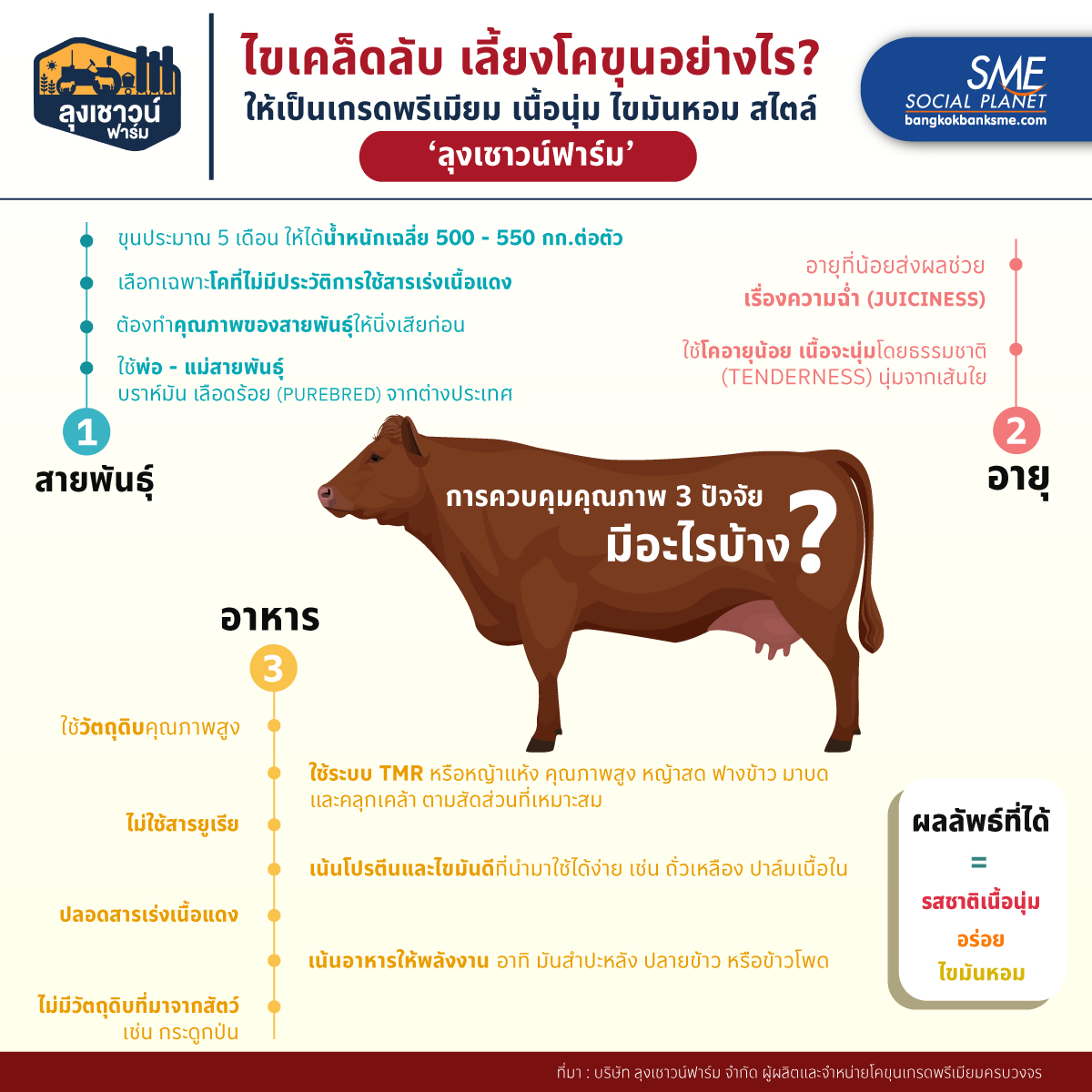 การเลี้ยงโคหรือวัวให้อ้วนท้วนสมบูรณ์ เป็นเรื่องที่ทำได้ไม่ยาก แต่การเลี้ยงให้ได้คุณภาพสม่ำเสมอ เป็นเรื่องที่ไม่ง่ายนัก อย่างเช่น ‘ลุงเชาวน์ฟาร์ม’ เขาบริหารจัดการ และมีเทคนิคการขุนโคอย่างไร? ให้ยกระดับสู่เกรดพรีเมียม ที่มี เนื้อนุ่ม ไขมันหอม อร่อย โดนใจผู้บริโภค Bangkok Bank SME มีเคล็ดลับมาฝากกัน