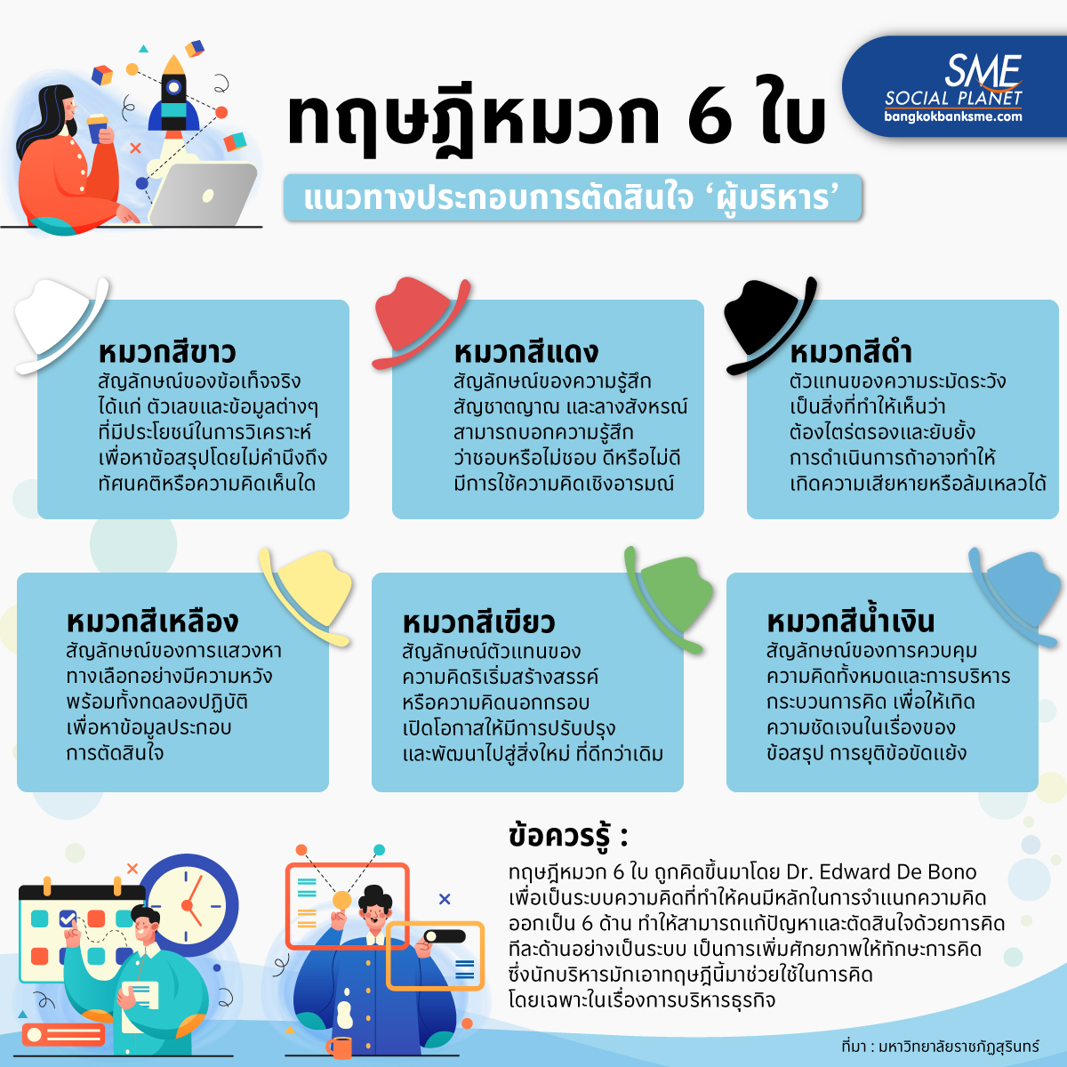 การอยู่ในสถานะผู้นำองค์กรหรือผู้บริหารบางครั้งเมื่อมีปัญหาเข้ามาก็เป็นเรื่องยากที่ต้องตัดสินใจ ทำให้ใช้เวลาในการหาข้อสรุปนานกว่าที่จะเป็น เรื่องนี้หากนำทฤษฎี Six Thinking Hats หรือการคิดแบบหมวก 6 ใบ ไปใช้เป็นแนวทางการแก้ปัญหา ก็อาจนำไปสู่ความคลี่คลายได้ ทำให้สามารถแก้ปัญหาและตัดสินใจด้วยการคิดทีละด้านอย่างเป็นระบบ เป็นการเพิ่มศักยภาพให้ทักษะการคิด ไม่คิดกระโดดไปกระโดดมา หรือคิดพร้อมกันทุกอย่างในเวลาเดียวกัน ผู้บริหารหรือผู้นำองค์กรสามารถนำไปปรับใช้ในการทำงานได้