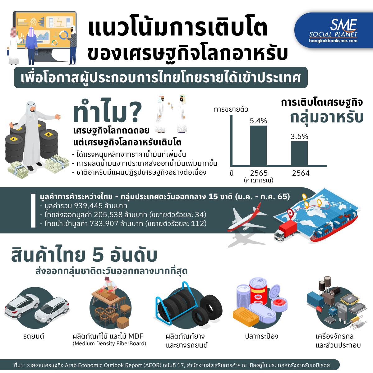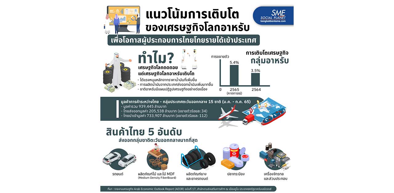 วิกฤตเศรษฐกิจทั่วโลกถดถอย แต่ทำไมเศรษฐกิจโลกอาหรับกลับเติบโต อะไรเป็นปัจจัยเกื้อหนุน? แล้วเมื่อกลุ่มประเทศตะวันออกกลางเศรษฐกิจขยายตัวเช่นนี้ Bangkok Bank SME จึงขอชี้ช่องส่งออกมาให้ได้ทราบ เพื่อที่ผู้ประกอบการ SME ไทย จะคว้าโอกาสนี้ไว้ให้ได้ เป็นอีกหนึ่งช่องทางสร้างรายได้เข้าประเทศในห้วงที่เศรษฐกิจอาจซบเซาอีกนาน