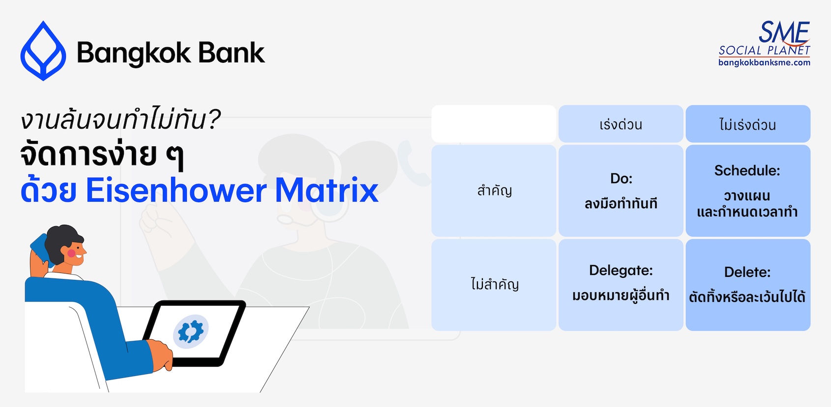 สำหรับผู้ประกอบการที่ต้องจัดการภารกิจหลากหลายในแต่ละวัน วันนี้ Bangkok Bank SME ขอแนะนำ เทคนิคการจัดลำดับความสำคัญงานด้วย “Eisenhower Matrix” เครื่องมือง่าย ๆ ที่ช่วยเพิ่มประสิทธิภาพการทำงาน (Productivity) ได้อย่างเห็นผล