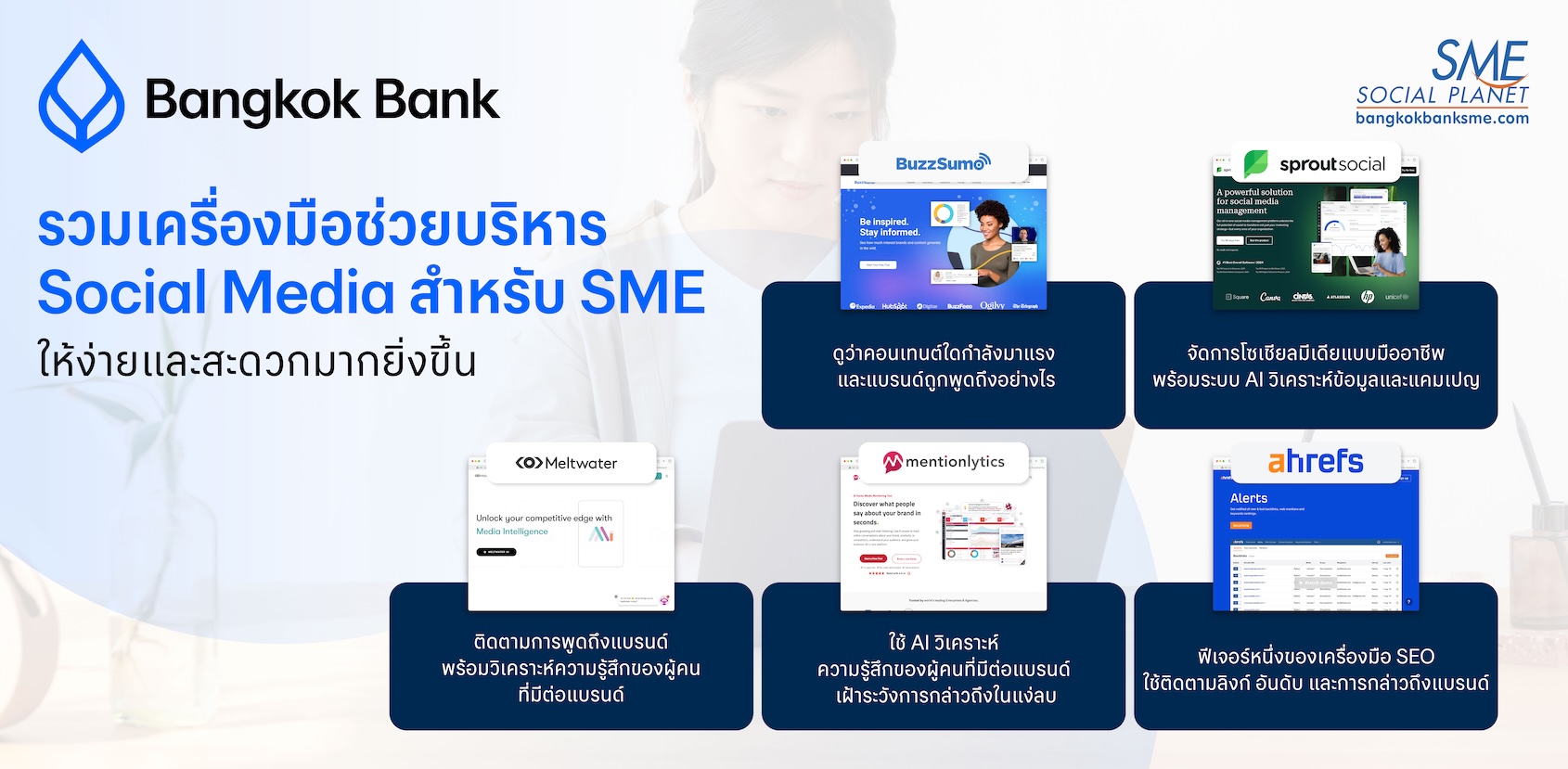 เพื่อให้คุณทำงานได้ง่ายขึ้น Bangkok Bank SME ขอแนะนำเครื่องมือจัดการโซเชียลมีเดียที่ช่วยให้คุณ “รู้เร็ว แก้ไว วิเคราะห์ได้ลึก” ครอบคลุมทุกมิติของแบรนด์ในโลกออนไลน์