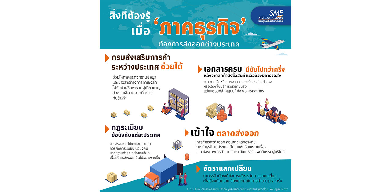 การบุกตลาดต่างประเทศ ถือเป็นอีกหนึ่งโอกาสสำคัญที่สามารถผลักดันให้ธุรกิจเติบโตได้ ซึ่งแต่ละชาติที่เราจะไปทำการค้าด้วยนั้นมีรายละเอียดต่างๆ ที่ต้องทำการบ้านให้ดี เพื่อจะได้ไม่เกิดอุปสรรค - ติดปัญหาต่างๆ ซึ่งอาจทำให้เสียโอกาสทางธุรกิจได้ ดังนั้น Bangkok Bank SME จึงขอนำสิ่งที่ต้องรู้ เมื่อ ‘ภาคธุรกิจ’ ต้องการส่งออกมาให้ได้ทราบ เพื่อการรุกตลาดต่างประเทศแล้วไปโลด ประสบความสำเร็จในต่างแดน
