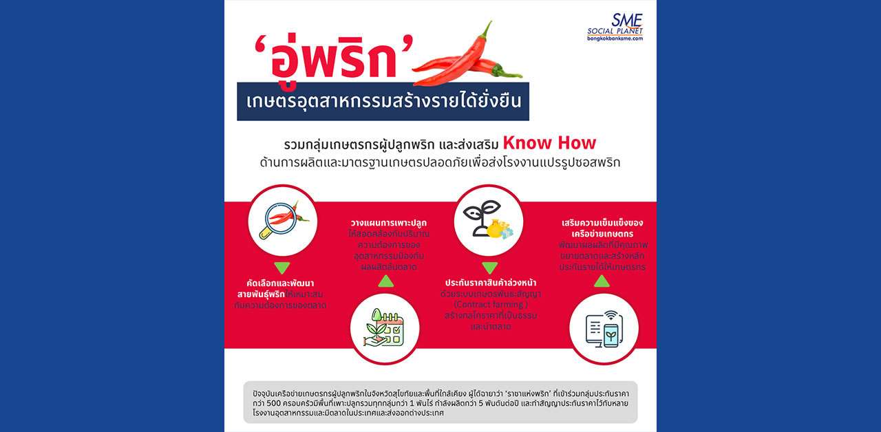 นอกจากอู่ข้าว อู่น้ำ ไทยยังเป็น ‘อู่พริก’ จากการรวมกลุ่มของเครือข่ายเกษตรกรผู้ปลูกพริกในจังหวัดสุโขทัยและใกล้เคียง มุ่งพัฒนาคุณภาพผลผลิต และเชื่อมโยงซัพพลายเชนทั้งหมดไว้ด้วยระบบเกษตรพันธะสัญญา ประกันราคาล่วงหน้า และขายผลผลิตให้โรงงานอุตสาหกรรมโดยตรง สร้างรูปแบบเกษตรอุตสาหกรรมที่ยั่งยืน