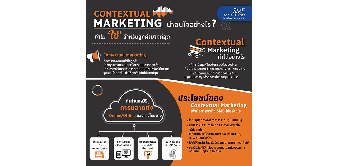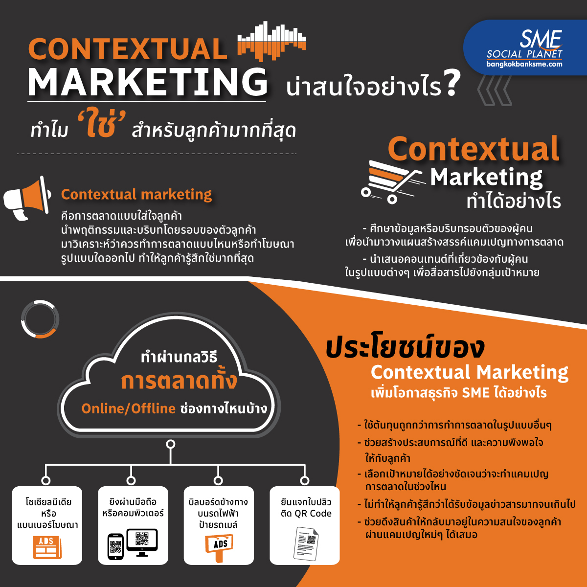 รู้จัก Contextual Marketing การตลาดแบบใส่ใจ โฆษณาแบบเข้าใจบริบท ทำไม? ใช่ สำหรับลูกค้ามากที่สุด กับกลวิธีการที่จะมาดึงดูดลูกค้าให้อยู่หมัด เพื่อตอบโจทย์กลยุทธ์การตลาดยุคใหม่ กับโอกาสชั้นดีที่จะทำให้ลูกค้าประทับใจจากการหยิบฉวยโอกาสของบริบทรอบตัวลูกค้าที่ใครๆ ก็มองข้ามให้กลายมาเป็นโอกาสสร้างยอดขายให้กับธุรกิจมากที่สุด