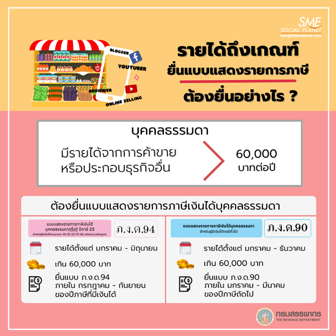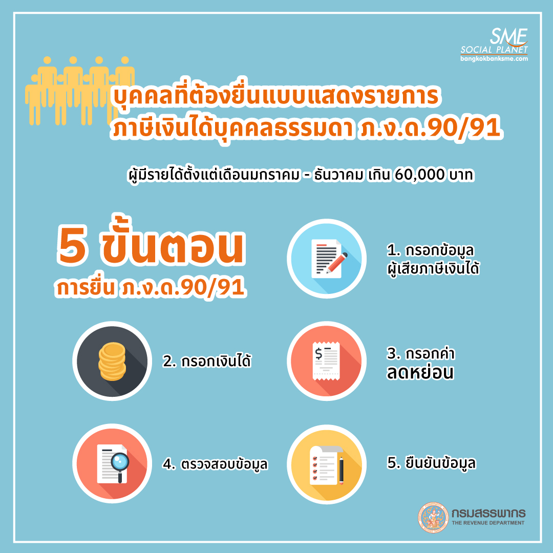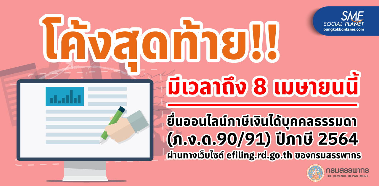 โดยหากท่านมีเงินได้จากเงินเดือน ค่าจ้าง การค้าขาย หรือการประกอบธุรกิจอื่นๆ ตามมาตรา 40(1)-(8) แห่งประมวลรัษฎากร ท่านสามารถยื่นแบบแสดงรายการภาษีเงินได้บุคคลธรรมดา (ภ.ง.ด.90/91) ปีภาษี 2564 ทางออนไลน์ได้ภายในวันที่ 8 เมษายน 2565 ผ่านทางระบบ E-FILING (https://efiling.rd.go.th/rd-cms/) ของกรมสรรพากร