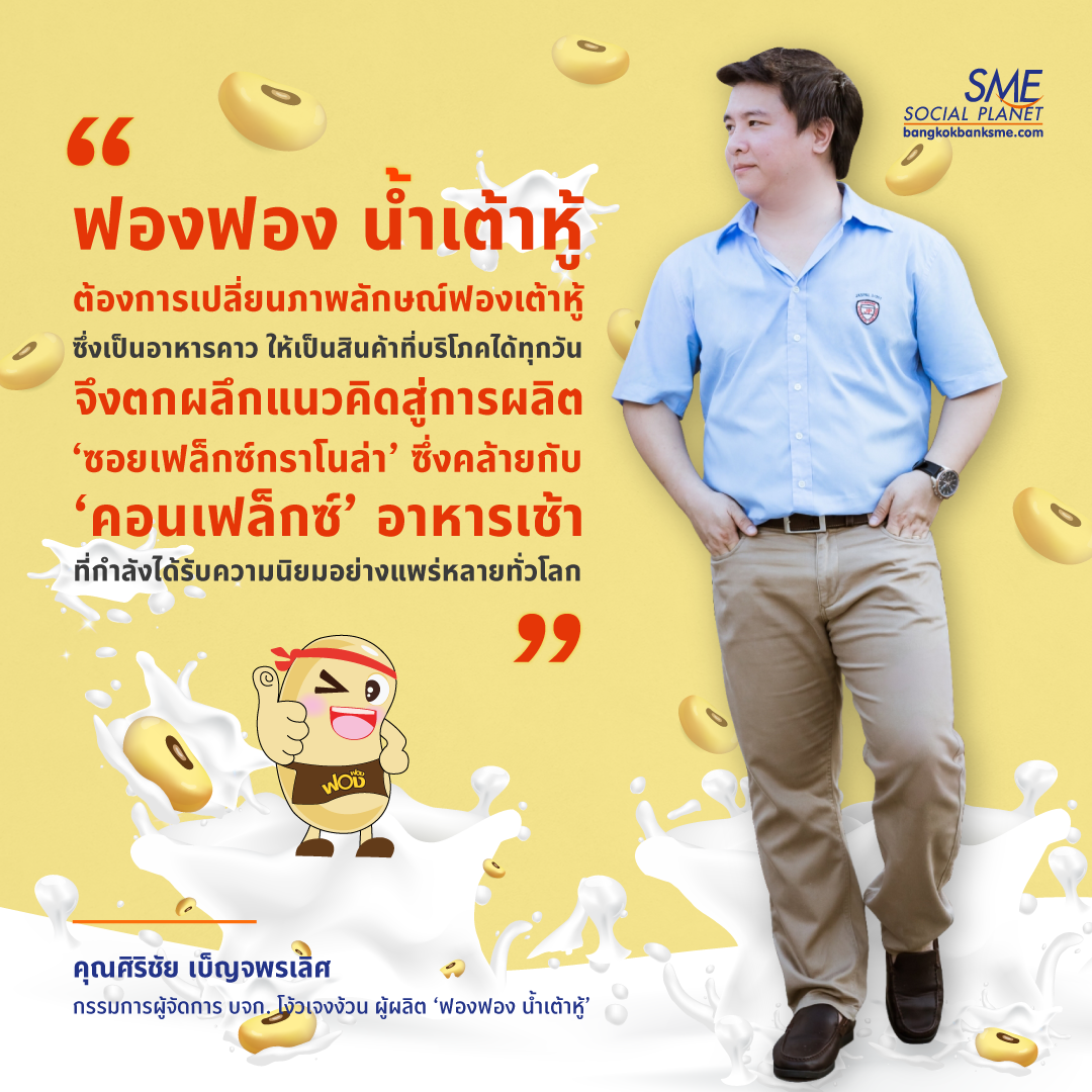 ด้วยความที่ผู้คนคุ้นชินว่า ‘เต้าหู้’ คืออาหารคาว บจก. โง้วเจงง้วน ผู้ผลิต ‘ฟองฟอง’ แบรนด์น้ำเต้าหู้ผสมฟองเต้าหู้เจ้าแรกของเมืองไทย จึงตั้งโจทย์ว่าต้องเปลี่ยนภาพลักษณ์ใหม่ ต้องทำอย่างไรให้สินค้าสามารถบริโภคได้ทุกวัน ไม่ต้องแช่เย็น ไม่เสียง่าย นำไปสู่แนวคิดในการพัฒนาผลิตภัณฑ์ ‘ซอยเฟล็กซ์กราโนล่า’ อาหารเช้าที่ใครๆ ก็รับประทานได้