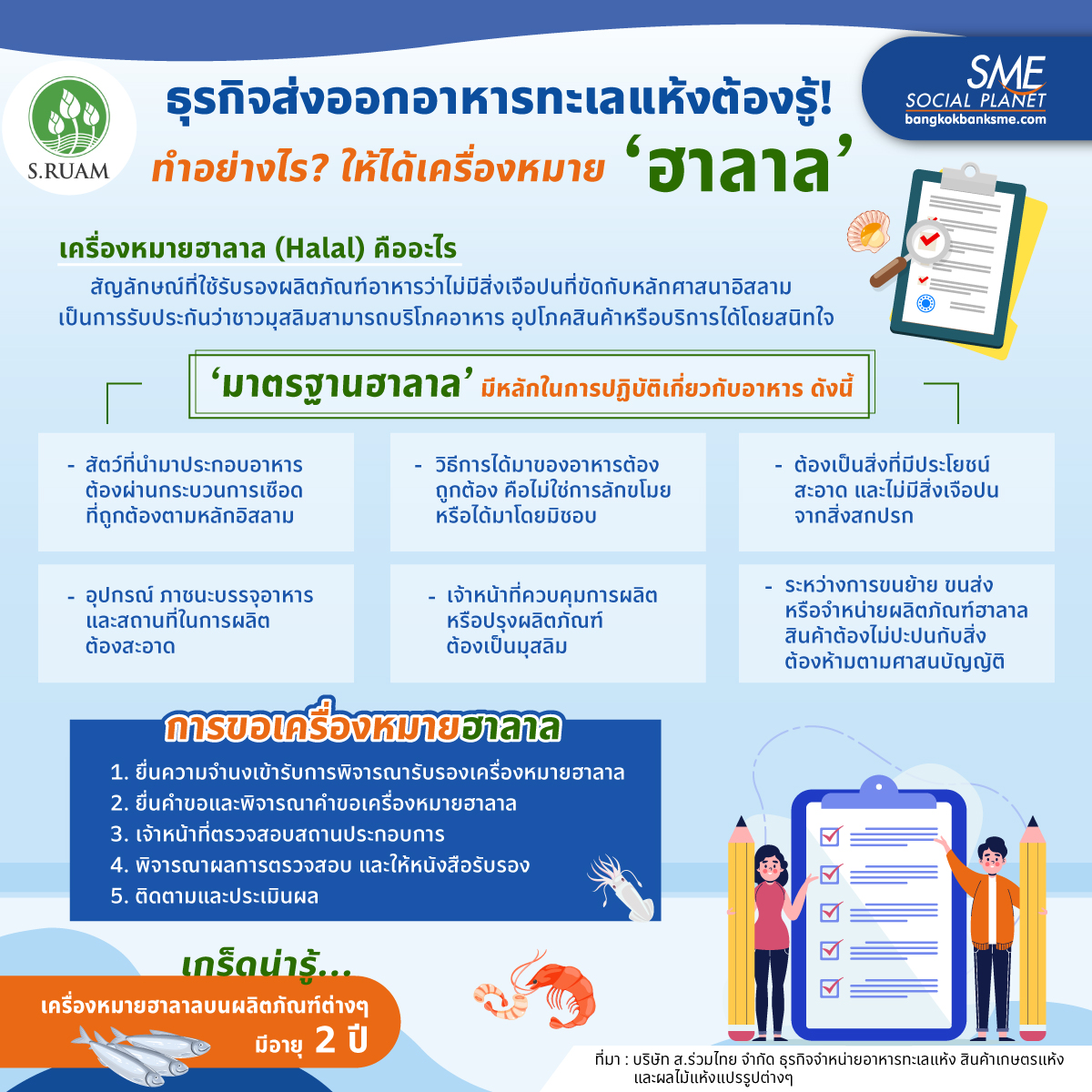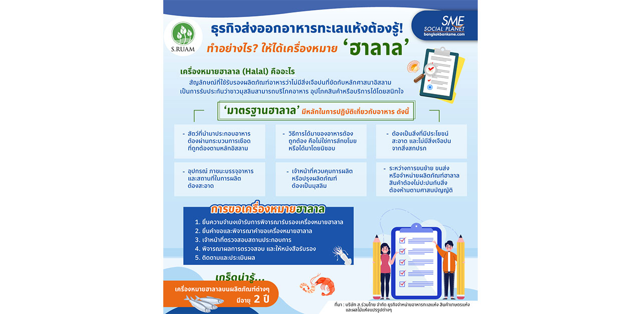 ปัจจุบันผู้บริโภคชาวมุสลิมทั่วโลกมีมากกว่า 2,000 ล้านคน ตลาดอาหารฮาลาลจึงมีขนาดใหญ่มหาศาล มูลค่าตลาดทั่วโลกประมาณ 1.2 ล้านล้านดอลลาร์สหรัฐ โดยไทยมีมูลค่าส่งออกถึง 35,037 ล้านดอลลาร์สหรัฐฯ คิดเป็น 2.44% ของมูลค่าตลาดอาหารฮาลาลโลก จึงเป็นโอกาสของ ส.ร่วมไทย ในการขยายตลาดอาหารทะเลแห้งแปรรูปสู่กลุ่มลูกค้ามุสลิมมากขึ้น แต่การจะขายสินค้าให้กับผู้บริโภคมุสลิมได้นั้น สิ่งสำคัญคือ สินค้าต้องผ่านการรับรองเครื่องหมาย ‘ฮาลาล’ เพื่อสร้างความเชื่อมั่นให้กับผู้บริโภค การที่ผู้ประกอบการจะได้เครื่องหมายฮาลาล ต้องทำอย่างไรบ้าง? หาคำตอบได้ที่ Bangkok Bank SME
