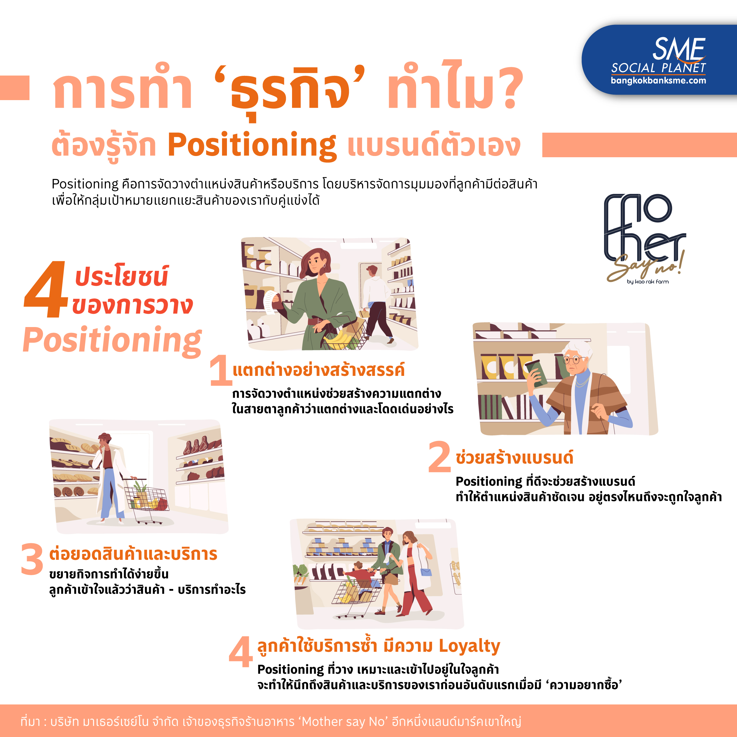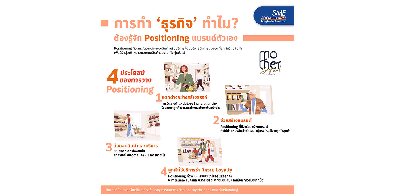 ‘การจะทำให้ธุรกิจประสบความสำเร็จได้ ต้องมีหลากหลายองค์ประกอบประจวบเหมาะกันเพื่อให้กิจการไปถึงฝั่งฝัน Bangkok Bank SME ขอนำอีกหนึ่งกลยุทธ์สู่ความ Success มาให้ได้รู้จักก็คือ การรู้จักวาง Positioning แบรนด์ตัวเอง ซึ่งบริษัท มาเธอร์เซย์โน จำกัด เจ้าของธุรกิจร้านอาหาร ‘Mother say No’ ได้นำกลยุทธ์ดังกล่าวมาปรับใช้กับธุรกิจ สู่ความสำเร็จเป็นอีกหนึ่งแลนด์มาร์คชื่อดัง ณ เขาใหญ่ ที่นักเดินทางให้ความสนใจเช็กอินเข้าไปลิ้มลองรสชาติอันปรารถนาเมื่อมาจังหวัดนครราชสีมา..
