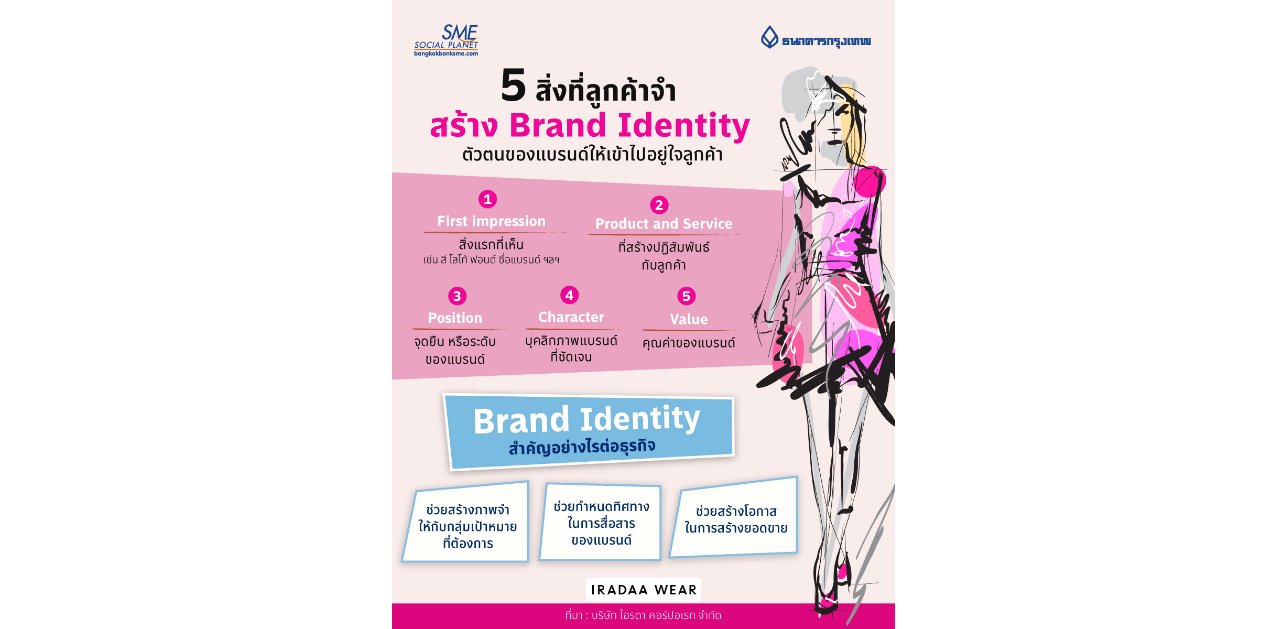ลูกค้าจำอะไร? Brand Identity สร้างตันตนของแบรนด์ในใจลูกค้า หรืออาจจะบอกว่าเป็นแบรนด์ที่ลูกค้านึกถึงเป็นลำดับแรก ๆ หนึ่งในกลยุทธ์สำคัญของการสร้างแบรนด์สำหรับสินค้าหรือบริการใหม่ ๆ และสร้างโอกาสให้แบรนด์ได้เกิดการปฏิสัมพันธ์กับลูกค้าผ่านช่องทางหรือกระบวนการต่าง ๆ กระนั้น ในทุกวันนี้ มีแบรนด์สินค้ามากมายเกิดขึ้นในตลาด การที่แบรนด์ใหม่จะสามารถทำให้ลูกค้าได้ และเลือกซื้อ ต้องใช้เวลา ความยึดมั่นที่สิ่งที่ทำ และกลยุทธ์การตลาด ข้อมูลจากบทสัมภาษณ์ บริษัท ไอรดา คอร์ปอเรท จำกัด ธุรกิจผลิตและจำหน่ายเสื้อผ้าแฟชั่นจากดีไซเนอร์ แบรนด์ IRADA