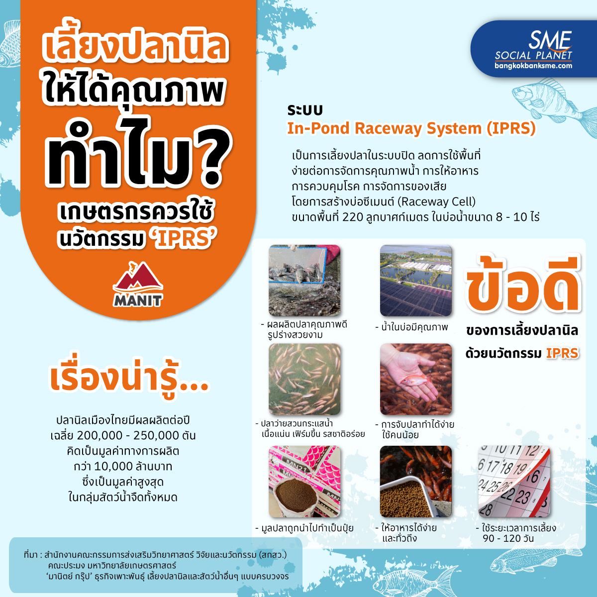 การเลี้ยงปลานิลด้วยระบบ In-Pond Raceway System (IPRS) คือหนึ่งในวิธียกระดับอุตสาหกรรมการเพาะเลี้ยงสัตว์น้ำเมืองไทย ที่ทางภาครัฐ หน่วยงานที่เกี่ยวข้อง ‘มานิตย์ กรุ๊ป’ ได้ร่วมมือกัน เพื่อให้เกษตรกรมีความเข้มแข็งและยั่งยืน พัฒนาคุณภาพชีวิตผู้ประกอบธุรกิจการเลี้ยงปลานิลให้ดีขึ้น รายได้สูงขึ้น และร่วมกันมีส่วนร่วมในการตระหนักถึงความรับผิดชอบต่อสังคม - สิ่งแวดล้อม ซึ่งทั่วโลกกำลังให้ความสำคัญ