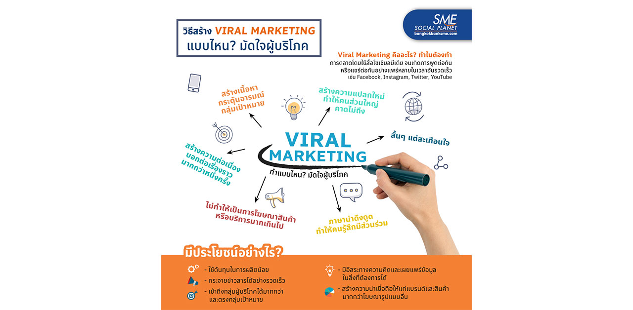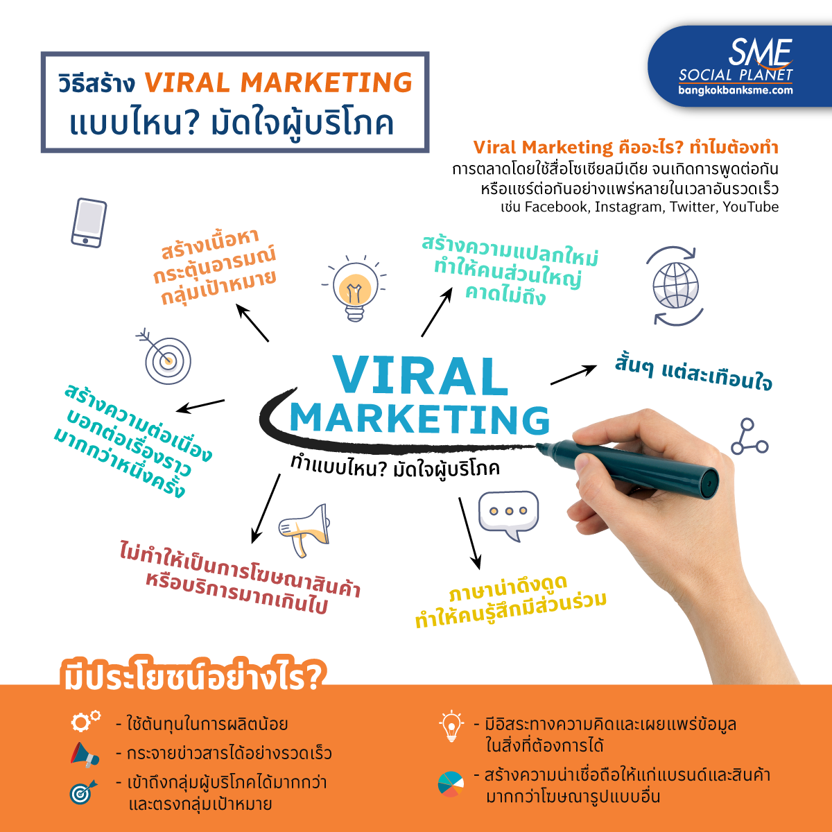 Viral Marketing อีกหนึ่งกลยุทธ์การตลาดที่ได้รับความนิยมมากเนื่องจากเทรนด์ Social Media กำลังมาแรง เพื่อช่วยให้ภาคธุรกิจสร้างการตลาดตอบโจทย์ผู้บริโภคอย่างตรงจุด มารู้จักกับวิธีการสร้างไวรัลมาร์เก็ตติ้ง ใช้ต้นทุนต่ำ แต่ต้องอาศัยความ Creative เป็นอย่างสูง ช่วยสร้างแบรนด์ และขยายฐานการตลาดได้อย่างรวดเร็ว
