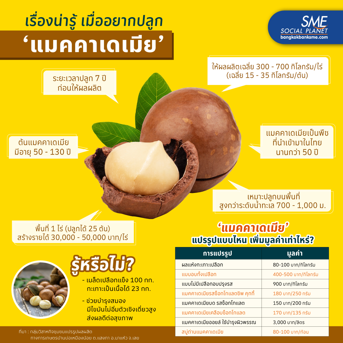 แมคคาเดเมีย (Macadamia) พืชเศรษฐกิจจากยอดดอยสู่ไม้ผลที่ สร้างงาน สร้างรายได้ให้แบรนด์ ‘แมคเลย’ ของ ‘กลุ่มวิสาหกิจชุมชนแปรรูปแมคคาเดเมียบ้านบ่อเหมืองน้อย’ ปัจจุบันได้รับความนิยมในการนำมาแปรรูปมากมาย และเป็นที่ต้องการของตลาดสูง เนื่องจากมีรสชาติที่หอมมัน อุดมไปด้วยสารอาหารดีต่อสุขภาพ Bangkok Bank SME จึงนำเกร็ดความรู้เกี่ยวกับ แมคคาเดเมีย เจ้าถั่วเปลือกแข็งชนิดนี้ มีดีอย่างไร นำไปแปรรูปและสร้างอาชีพ สร้างรายได้อย่างไรกันบ้าง