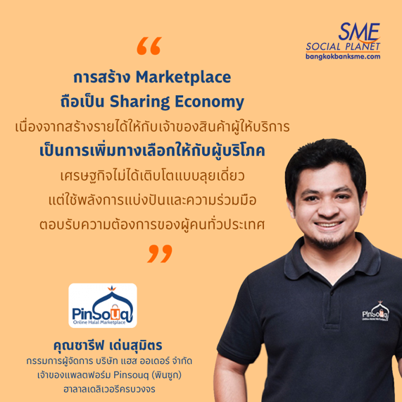 พินซูก (Pinsouq) แพลตฟอร์มฮาลาลเดลิเวอรีครบวงจรของคนไทย คืออีกหนึ่ง Case Study เศรษฐกิจแบบแบ่งปัน (Sharing Economy) ที่น่าสนใจ เนื่องจากสามารถตอบโจทย์การเปลี่ยนแปลงทางเทคโนโลยีก้าวกระโดด รวมถึงพฤติกรรมของผู้บริโภคที่เปลี่ยนไปตามยุคสมัยได้ เป็นอีกหนึ่งไอเดียธุรกิจที่เหมาะนำไปประยุกต์ใช้ - ต่อยอดสร้างประโยชน์ให้กับองค์กร