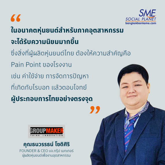 ซึ่งสิ่งที่ผู้ผลิตหุ่นยนต์ไทยต้องมองให้ออกคือทำอย่างไรให้ผู้ประกอบการบ้านเรานำหุ่นยนต์ไปใช้ให้เกิดประสิทธิภาพสูงสุด