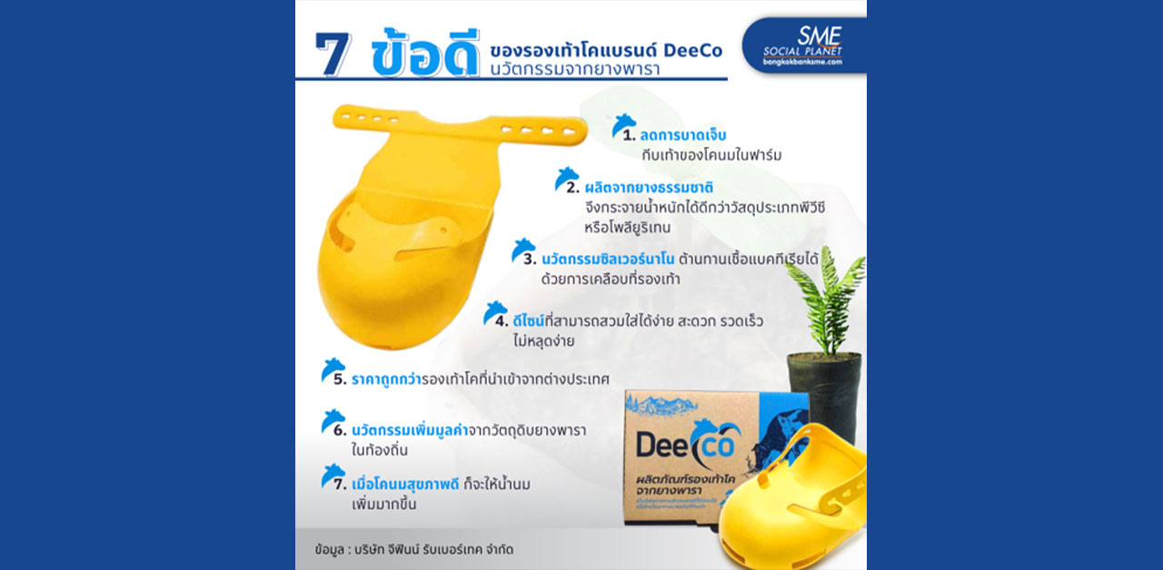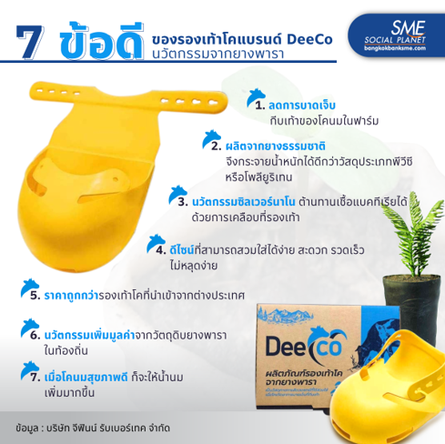 จาก Pain Point ยางพาราสู่โมเดลรองเท้าโคแบรนด์ Deeco ที่ผลิตจากยางพาราธรรมชาติ เป็นวัสดุชนิดเดียวกับที่สัตว์แพทย์ใช้ใส่ให้กับโคนมเมื่อเกิดอาการบาดเจ็บที่กีบเท้า ช่วยแก้ปัญหาในการฟื้นฟูอาการบาดเจ็บของโคนมที่ผลิตโดยคนไทย สุดยอดนวัตกรรมที่ตอบโจทย์ฟาร์มปศุสัตว์ทดแทนสินค้านำเข้าจากต่างประเทศ มาดูกันว่าดีกว่าอย่างไร