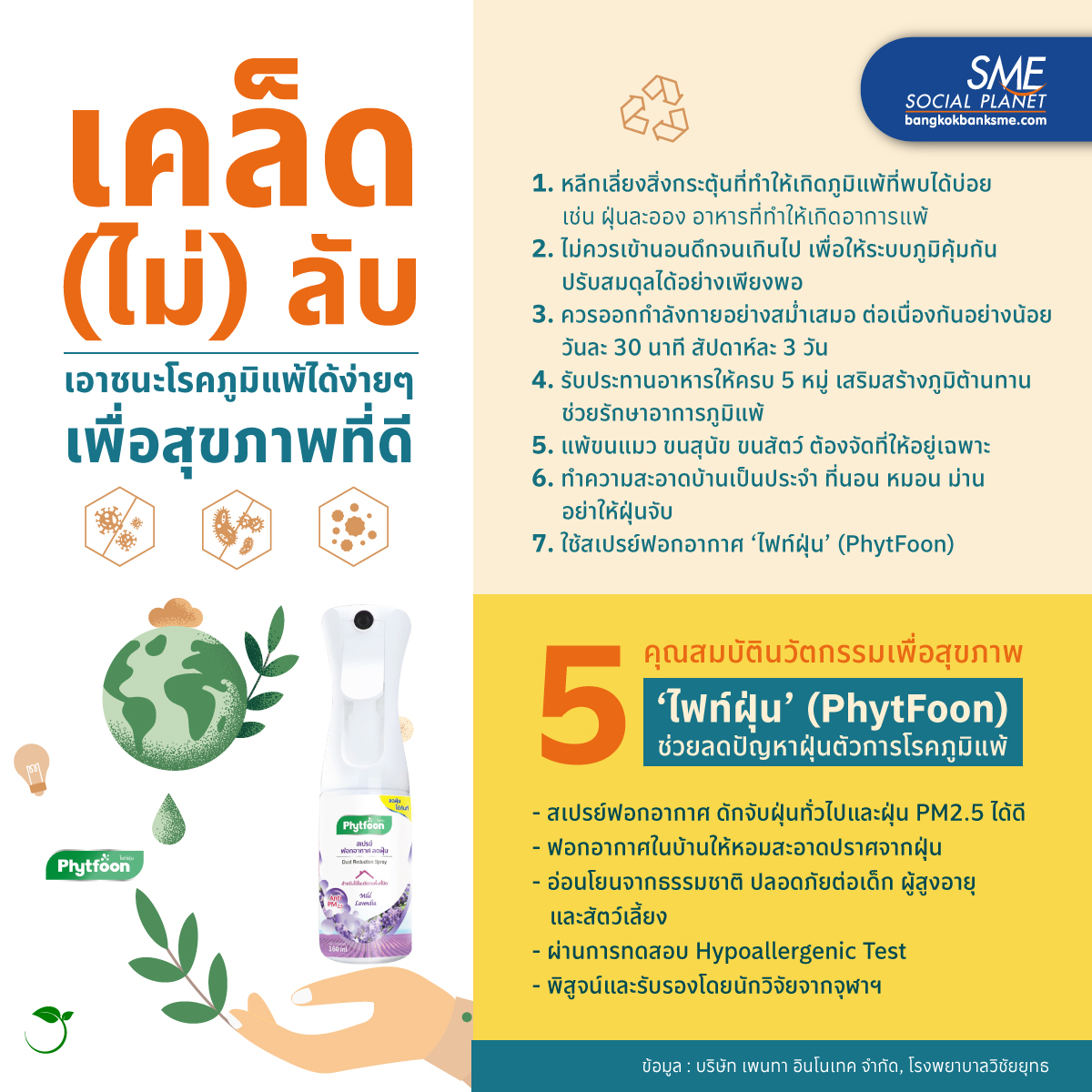 โรคภูมิแพ้ เป็นโรคที่พบได้บ่อยที่สุดในประเทศไทย ยิ่งในสภาพแวดล้อมในปัจจุบัน ซึ่งเต็มไปด้วยมลภาวะฝุ่น ควัน สารพิษ น้ำเน่าเสีย สิ่งเหล่านี้ล้วนเพิ่มความเสี่ยงให้ระบบภูมิคุ้มกันภายในร่างกายต้องทำงานเพิ่มมากขึ้น ทำให้ร่างกายอ่อนแอลง และเพิ่มโอกาสในการป่วยด้วยโรคภูมิแพ้มากยิ่งขึ้น รู้จัก 7 วิธีดูแลตัวเอง เอาชนะโรคภูมิแพ้ได้ง่ายๆ พร้อมนวัตกรรมเพื่อสุขภาพ ‘ไฟท์ฝุ่น’ (PhytFoon) ที่จะเข้ามาช่วยลดปัญหาฝุ่นตัวการโรคภูมิแพ้ ตอบโจทย์สุขภาพที่ดีขึ้น