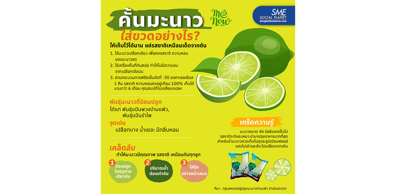 รสเปรี้ยวและกลิ่นหอมของน้ำมะนาวเป็นเสน่ห์ที่ช่วยเติมแต่งเพิ่มรสชาติให้กลมกล่อม และทำเป็นเครื่องดื่มเย็นๆ เพิ่มความสดชื่นชุ่มคอได้อีกด้วย แต่การจะได้มะนาวที่มีรสชาติดี มีกลิ่นหอม ต้องทำอย่างไร ‘กลุ่มสหกรณ์ผู้ปลูกมะนาวบ้านแพ้ว ดำเนินสะดวก’ มีเคล็ดลับ การปลูกและเลือกซื้อมะนาว รวมไปถึงการแปรรูปและเก็บรักษาอย่างไร? ให้เก็บไว้ได้นาน แต่รสชาติเหมือนเด็ดจากต้น Bangkok Bank SME มีคำตอบ