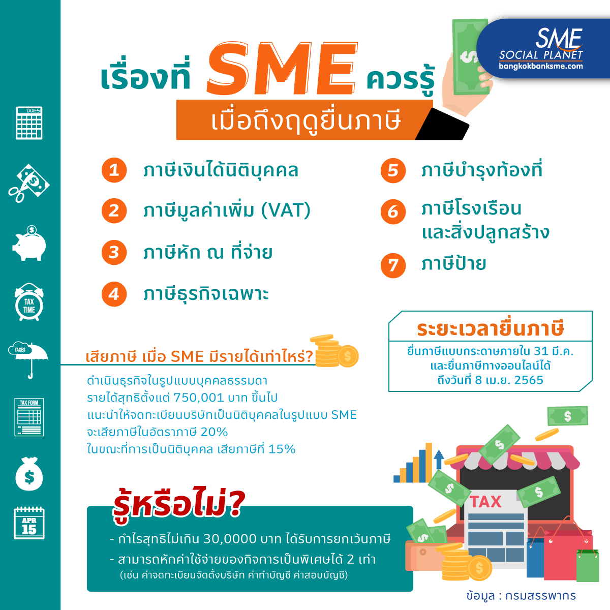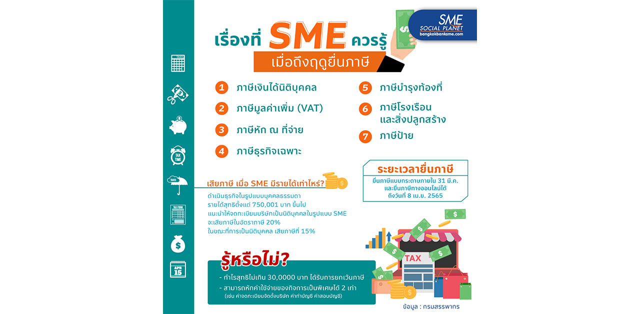 เรื่องที่ SME ควรรู้ เมื่อถึงฤดูยื่นภาษี เตรียมความพร้อมในเรื่องกฎหมายภาษีอากร กับสิ่งสำคัญที่จะทำให้ธุรกิจประสบความสำเร็จ ปราศจากปัญหา ความเสี่ยง ความเดือดร้อนที่อาจจะเกิดขึ้นได้ในภายหลัง พร้อมศึกษาและเข้าใจถึงรายละเอียดที่เกี่ยวกับภาษีเพื่อใช้สิทธิประโยชน์ต่างๆ รวมไปถึงการลดหย่อนภาษีอีกด้วย