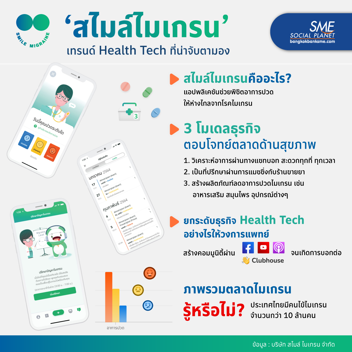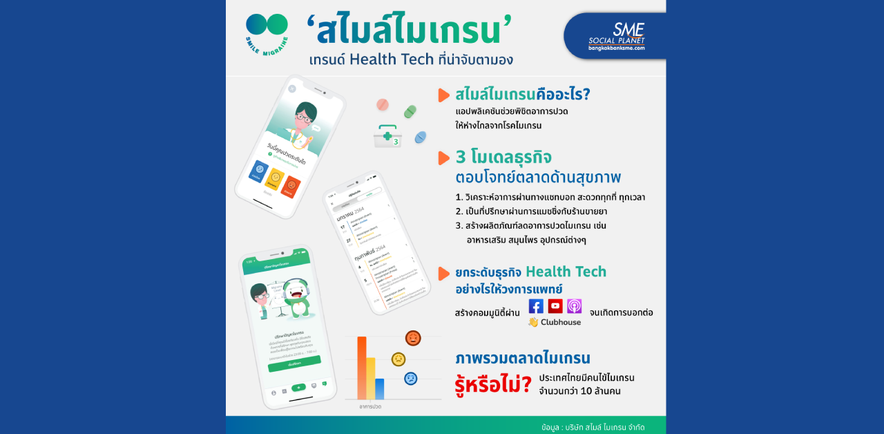 เจาะโมเดลธุรกิจ ‘Health Tech’ จากบริษัท สไมล์ ไมเกรน จำกัด กับนวัตกรรมยุคใหม่ที่จะเข้ามาตอบโจทย์ตลาดด้านสุขภาพ ด้วยการส่งต่อความสำเร็จกับ 3 โมเดลธุรกิจที่ครบวงจรของอีโคซิสเต็มด้านไมเกรน โดยเปลี่ยนจากการรักษาโรคและดูแลผู้ป่วยเป็นหลัก ไปสู่การดูแลสุขภาพแบบครบวงจร นับเป็นอีกความหวังของเทคโนโลยีการแพทย์ยุคใหม่เพื่อการรักษาและเข้าใจโรคมากยิ่งขึ้น
