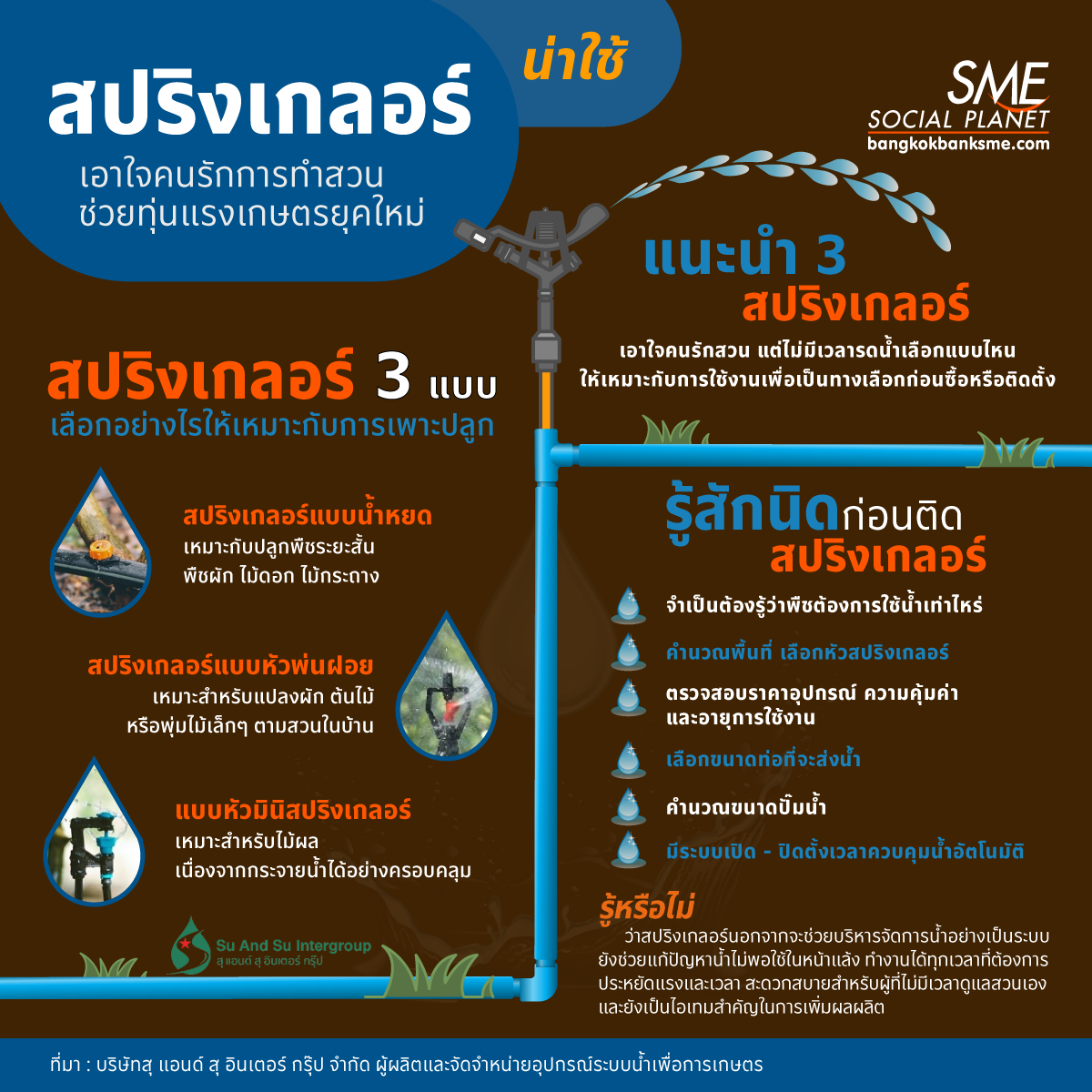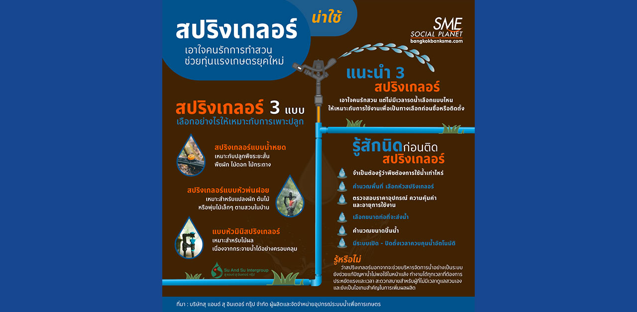 เอาใจคนรักสวนแต่ไม่มีเวลารดน้ำ แนะนำ 3 สปริงเกลอร์น่าใช้ของ สุ แอนด์ สุ ตัวช่วยทุ่นแรงเกษตรยุคใหม่ หมดปัญหาเรื่องน้ำไม่พอใช้ในหน้าแล้ง เลือกแบบไหนให้เหมาะกับการใช้งาน เพื่อเป็นทางเลือกก่อนซื้อหรือติดตั้ง