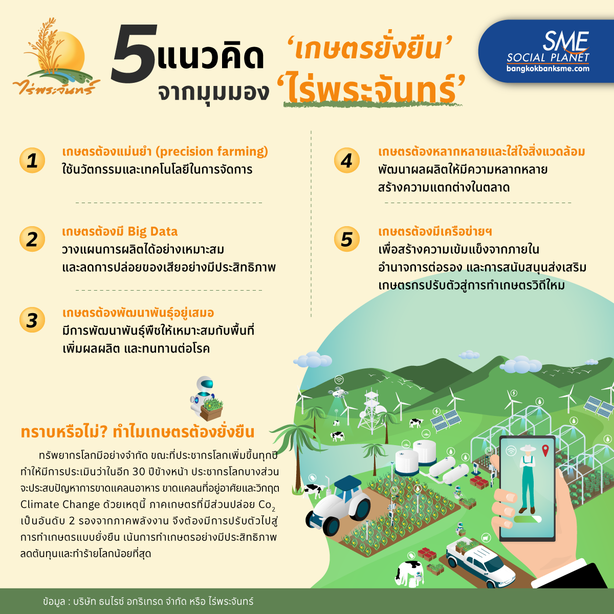 เกษตรยั่งยืนได้อย่างไร? แนวคิดเกี่ยวกับเกษตรกรรมที่ยึดหลัก การเกษตรยุคใหม่ที่ต้องใส่ใจคุณภาพการผลิต โดยนวัตกรรมและเทคโนโลยี ที่เหมาะสม ใช้ทรัพยากรอย่างมีประสิทธิภาพไม่ก่อให้เกิดผลเสียต่อสิ่งแวดล้อม และที่สำคัญเกษตรกรจะต้องมีความเป็นอยู่ที่ดีขึ้น สร้างความเข้มแข็งในชุมชน จากแนวคิด ‘ไร่พระจันทร์’ เครือข่ายเกษตรกรผู้ปลูกข้าวอินทรีย์ในจังหวัดพิจิตร