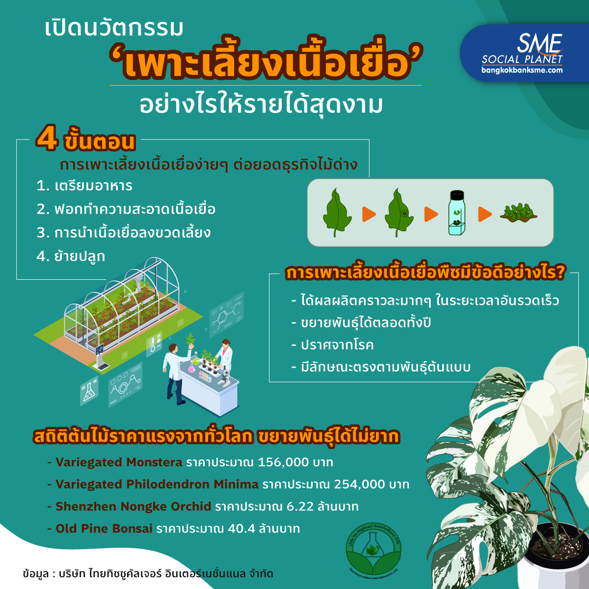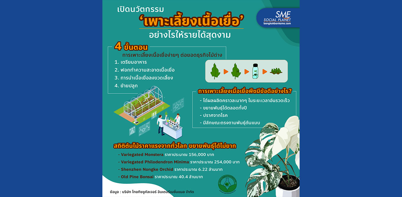 ธุรกิจกระแสแรง กับเทคนิคนวัตกรรมขยายพันธุ์พืชของบริษัท ไทยทิชชูคัลเจอร์ อินเตอร์เนชั่นแนล จำกัด ด้วยการ ‘เพาะเลี้ยงเนื้อเยื่อ’ ง่ายๆ อย่างไรให้รายได้งาม กับความเจริญก้าวกน้าในด้านการเกษตร ที่มีการพัฒนาเทคนิค ทำให้ได้ต้นพืชแบบใหม่ จำนวนมากอย่างรวดเร็วในเวลาอันจำกัด แถมยังได้คุณภาพดี พร้อมตอบโจทย์ความต้องการของตลาด สู่ธุรกิจรายได้งามที่กำลังเติบโต