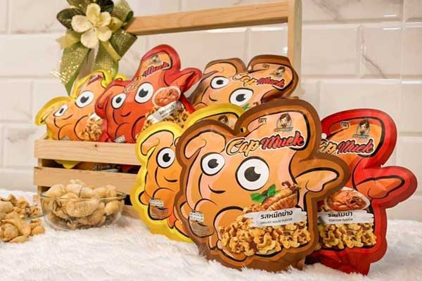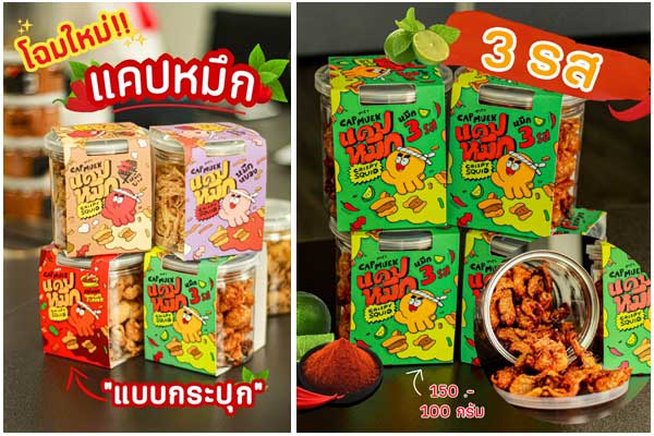 เมื่อได้ผลิตภัณฑ์ที่ดีแล้ว การพัฒนาแพคเกจจิ้งเป็นเรื่องสำคัญไม่แพ้กัน คุณยุวดี กล่าวว่า ตอนที่เริ่มทำแบรนด์ใหม่ ๆ ตัวเธอเองไม่มีความรู้ในเรื่องของธุรกิจมากนัก แคปหมึกของเธอจะอยู่ในซองสี่เหลี่ยมธรรมดา ๆ กระทั่งวันหนึ่งได้ไปออกบูทมีลูกค้าให้แนวคิดว่า ทำไมไม่ทำผลิตภัณฑ์ให้มีอัตลักษณ์ (Unique) ของตัวเองมากขึ้น จึงนำ Pain Point ตรงนี้มาพัฒนาแพคเกจจิ้งเป็นรูปปลาหมึก ที่มีความโดดเด่นสะดุดตา เพื่อสร้างการจดจำ โดยแพคเกจจิ้งจะสามารถแยกรสชาติให้ผู้บริโภคเห็นได้อย่างชัดเจน เช่น รสปลาหมึกย่างซองสีน้ำตาล รสต้มยำซองสีแดง รสลาบซองสีเหลือง