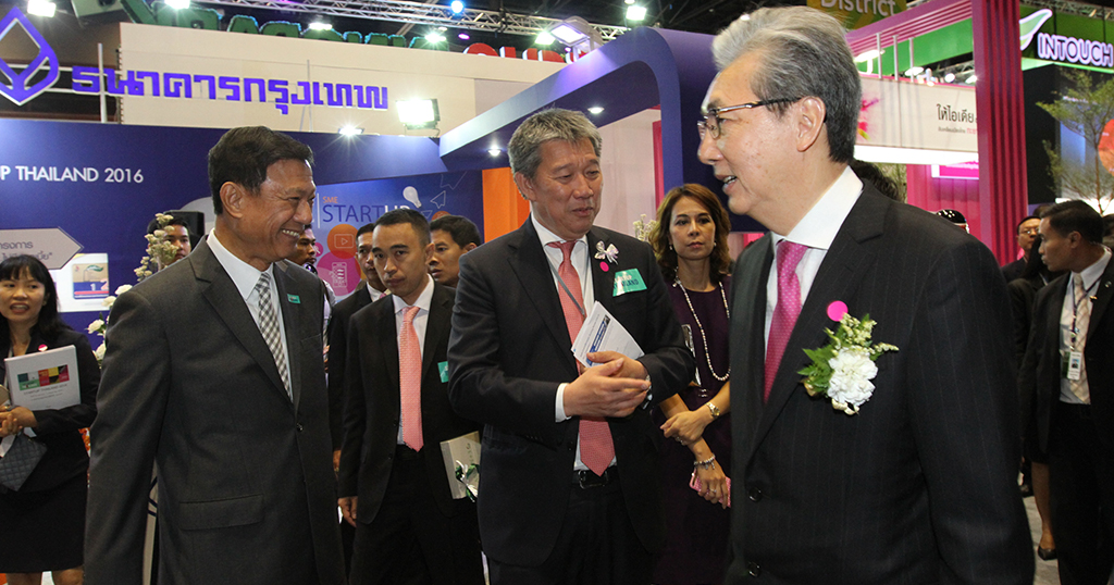 นายสุวรรณ แทนสถิตย์ กรรมการรองผู้จัดการใหญ่ นายวีระศักดิ์ สุตัณฑวิบูลย์ รองผู้จัดการใหญ่ นายปรียะมิตต์ เหตระกูล ผู้ช่วยผู้จัดการใหญ่ ธนาคารกรุงเทพ จำกัด (มหาชน) ร่วมให้การต้อนรับ ดร.สมคิด จาตุศรีพิทักษ์ รองนายกรัฐมนตรี ดร.กอบศักดิ์ ภูตระกูล ผู้ช่วยรัฐมนตรีประจำสำนักนายกรัฐมนตรี ในโอกาสเยี่ยมบูธธนาคารกรุงเทพในงาน ‘Start Up Thailand 2016’ ที่มีขึ้นระหว่างวันที่ 28 เมษายน ถึง 1 พฤษภาคม 2559 ณ ศูนย์ประชุมแห่งชาติสิริกิติ์