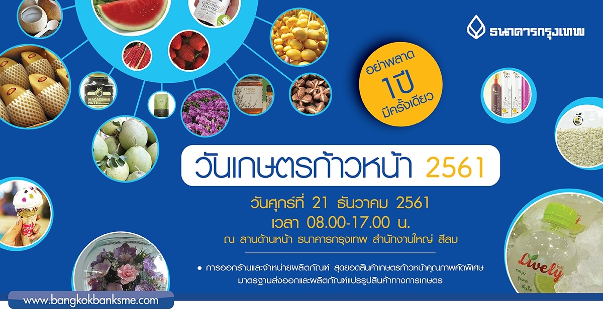 เชิญร่วมงาน "วันเกษตรก้าวหน้า 2561" วันศุกร์ที่ 21 ธันวาคม 2561 เวลา 08.00 - 17.00 น. ณ ลานด้านหน้า ธนาคารกรุงเทพ สำนักงานใหญ่ สีลม