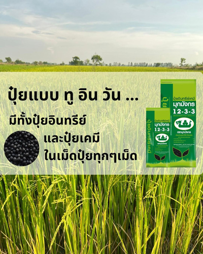 ปุ๋ยสูตร 12-3-3 +อินทรียวัตถุ 10 % ขึ้นไป หรือที่รู้ชื่อ ปุ๋ยอินทรีย์เคมีมุกมังกร การกำหนดสูตรปุ๋ยจะใช้สถิติการดูดซึมธาตุอาหารของพืช และการเคลื่อนย้ายธาตุอาหารไปเลี้ยงส่วนต่าง ๆ ของพืช โดยเน้นกำหนดอัตราส่วนแร่ธาตุไนโตรเจน (N) ที่มากกว่า ฟอสฟอรัส (P) และ โพแทสเซียม (K) ให้เหมาะสมกับความต้องการสารอาหารของพืช ซึ่งปุ๋ยอินทรีย์เคมีสูตร 12-3-3 มีการทดสอบและพิสูจน์แล้ว ว่าสามารถใช้ได้กับพืชผลทางการเกษตรทุกชนิด ทั้งยังช่วยให้คุณภาพของดินกลับมาดีขึ้น