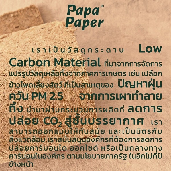 โดยแบรนด์ PAPA PAPER ใช้วัสดุที่ผลิตกระดาษจากเยื่อธรรมชาติ ทั้ง กล้วย เยื่อไผ่ และต้นข้าวโพดเหลือทิ้งทางการเกษตร นำมาเพิ่มมูลค่าผ่านนวัตกรรมการผลิตและออกแบบสินค้า รองรับตลาดที่ใส่ใจโลก รวมถึงตลาดต่างประเทศที่มีกฎระเบียบและมาตรการด้านสิ่งแวดล้อม สอดรับกับเป้าหมายลดการปล่อยก๊าซเรือนกระจก ซึ่งเป็นเมกะเทรนด์(Mega Trend ) ที่ทั่วโลกให้ความสำคัญ และปรับตัวไปในทิศทางนี้