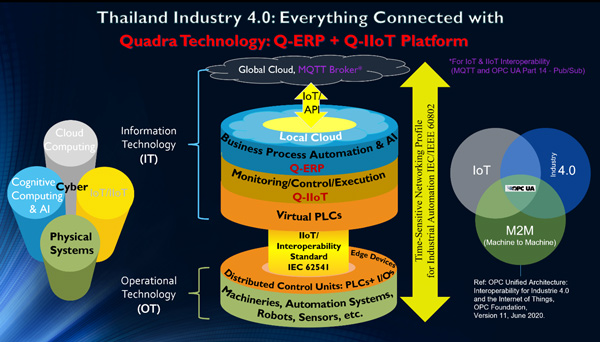 ดร.ประพิณ เผยว่า ในปัจจุบัน Industry 4.0 เริ่มเข้ามามีบทบาทในอุตสาหกรรมการผลิตเป็นอย่างมาก basic idea ก็คือ ในโรงงาน เรามี (ก) เครื่องจักรต่างๆ ระบบอัตโนมัติ Sensors หุ่นยนต์ ฯลฯ ทั้งหมดนี้เราต้องใช้ Technology ที่เรียกว่า Operational Technology (OT) และ (ข) Back Office เราต้องใช้ Technology ที่เรียกว่า Information Technology (IT) ดังนั้นความสามารถในการเชื่อมต่อข้อมูลระหว่าง OT และ IT ต่อเนื่องไปจนถึง Cloud (หรือการเชื่อมข้อมูลในแนวตั้ง) ก็คือ การทำ Industry 4.0 หรือ Everything Connected ทั้งหมดนี้ก็นำไปสู่เรื่องของ Material Requirements Planning (MRP) ซึ่งเป็นระบบการวางแผนการผลิตและควบคุมวัสดุที่ใช้คอมพิวเตอร์เข้ามาช่วยนั้นมีความสำคัญเป็นอย่างมากในการ Implement Industry 4.0 ซึ่งรวมอยู่ในระบบซอฟต์แวร์ในการทำธุรกิจ คือ ERP (Enterprise Resource Planning) ซึ่งถ้าไม่มีระบบซอฟต์แวร์ ERP คงจะเป็นการยากมากที่คุณจะ Implement Industry 4.0 ให้เป็นที่สำเร็จได้