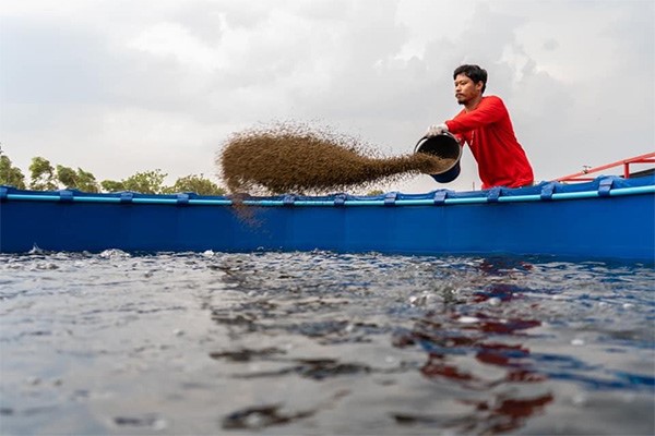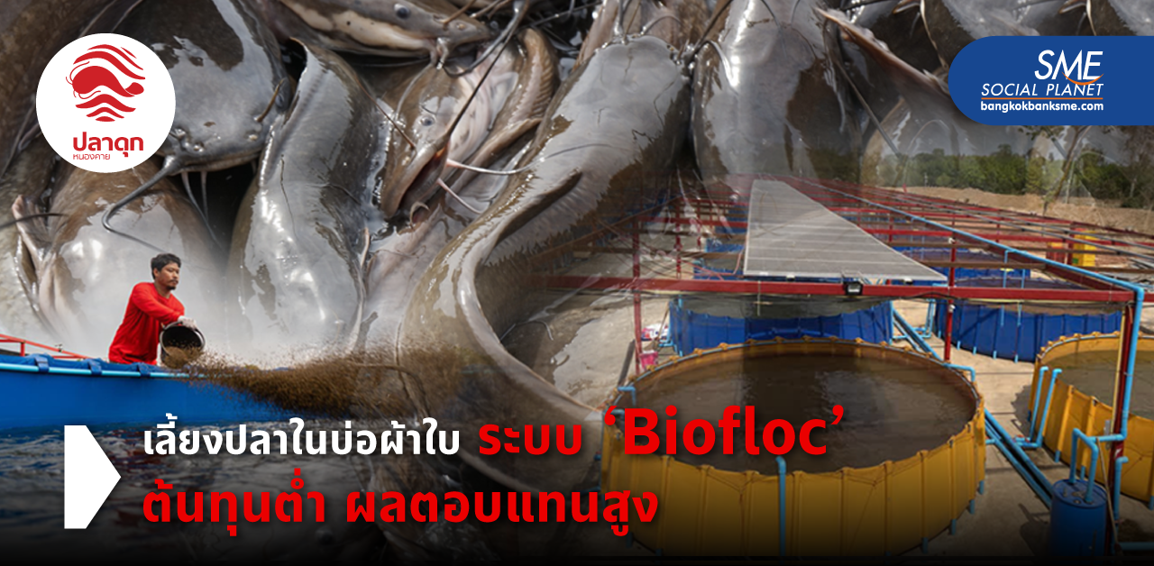 การเลี้ยงปลาในบ่อดินทั่วไป จะไม่นิยมเลี้ยงปลาให้แน่นบ่อหรือแออัดมากเกินไป เนื่องจากมีความเสี่ยงทั้งในด้านการเกิดโรค ปลากัดกัน กินกันเอง และแย่งอาหารกัน ทำให้ปลาโตช้า แต่การเลี้ยงในบ่อผ้าใบ ซึ่งคุณสมบัติของผ้าใบจะไม่ดูดซับของเสีย ดังนั้น การจัดการของเสียหรือตะกอน จึงเป็นส่วนสำคัญ โดยใช้จุลินทรีย์ไปช่วยจัดการของเสียในบ่อ หรืออธิบายให้เข้าใจง่าย ๆ คือระบบ ‘Biofloc’ เป็นกระบวนการเปลี่ยนของเสียหรือขี้ปลา ให้เป็นโปรตีนที่เป็นอาหารของปลานั่นเอง