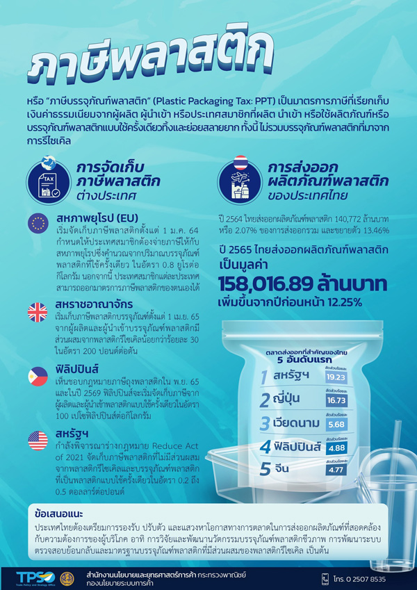 ด้านผู้อำนวยการสำนักงานนโยบายและยุทธศาสตร์การค้า (สนค.) ให้ข้อมูลเพิ่มเติมว่า ถึงแม้ตลาดสำคัญของไทยจะยังไม่มีการจัดเก็บภาษีพลาสติกในตอนนี้ แต่อนาคตอันใกล้นี้มีแนวโน้มที่ตลาดเหล่านี้จะจัดเก็บภาษีพลาสติก โดยเฉพาะสหรัฐอเมริกาเป็นตลาดส่งออกผลิตภัณฑ์พลาสติกอันดับ 1 ของไทย อยู่ระหว่างจัดทำร่างกฎหมาย ซึ่งย่อมส่งผลให้ผู้ส่งออกมีต้นทุนสูงขึ้น