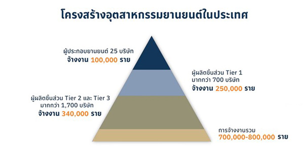 อุตสาหกรรมรถยนต์ไทย เป็นซัพพลายเชนของผู้ประกอบรถยนต์และผู้ผลิตชิ้นส่วนที่ยาวมาก มีความใกล้ชิดและมีการพัฒนาวิจัยร่วมกันกับผู้ผลิตรถยนต์ต่อมาก็จะทอดสายไปยังซัพพลายเชน Tier 2 ,3 ส่วนใหญ่แล้วการจ้างงานจะเป็นผู้ประกอบการไทยในอุตสาหกรรมยานยนต์ เป็นกลุ่มซัพพลายเชนที่มีคุณภาพสูงมากเพราะในรถยนต์ 1 คันถ้าเป็นระบบสันดาปภายใน หรือ ICE (Internal Combustion Engine) จะประกอบไปด้วยชิ้นส่วนกว่า 30,000 ชิ้น ดังนั้นหากซัพพลายเชนส่งไม่ได้ขาดไปซักชิ้นจะไม่สามารถประกอบรถยนต์ได้